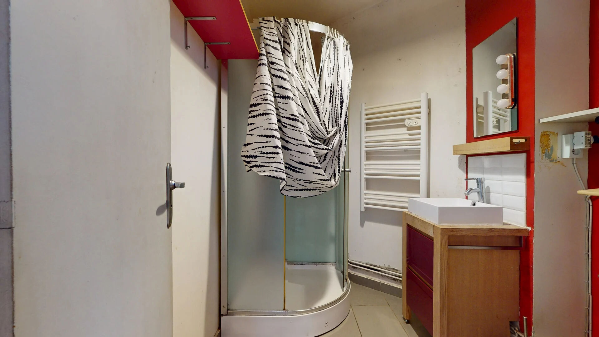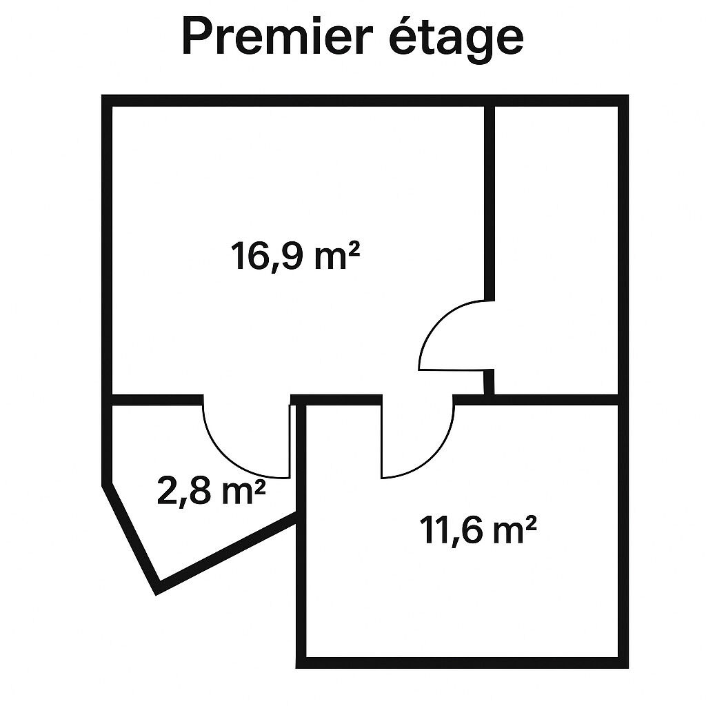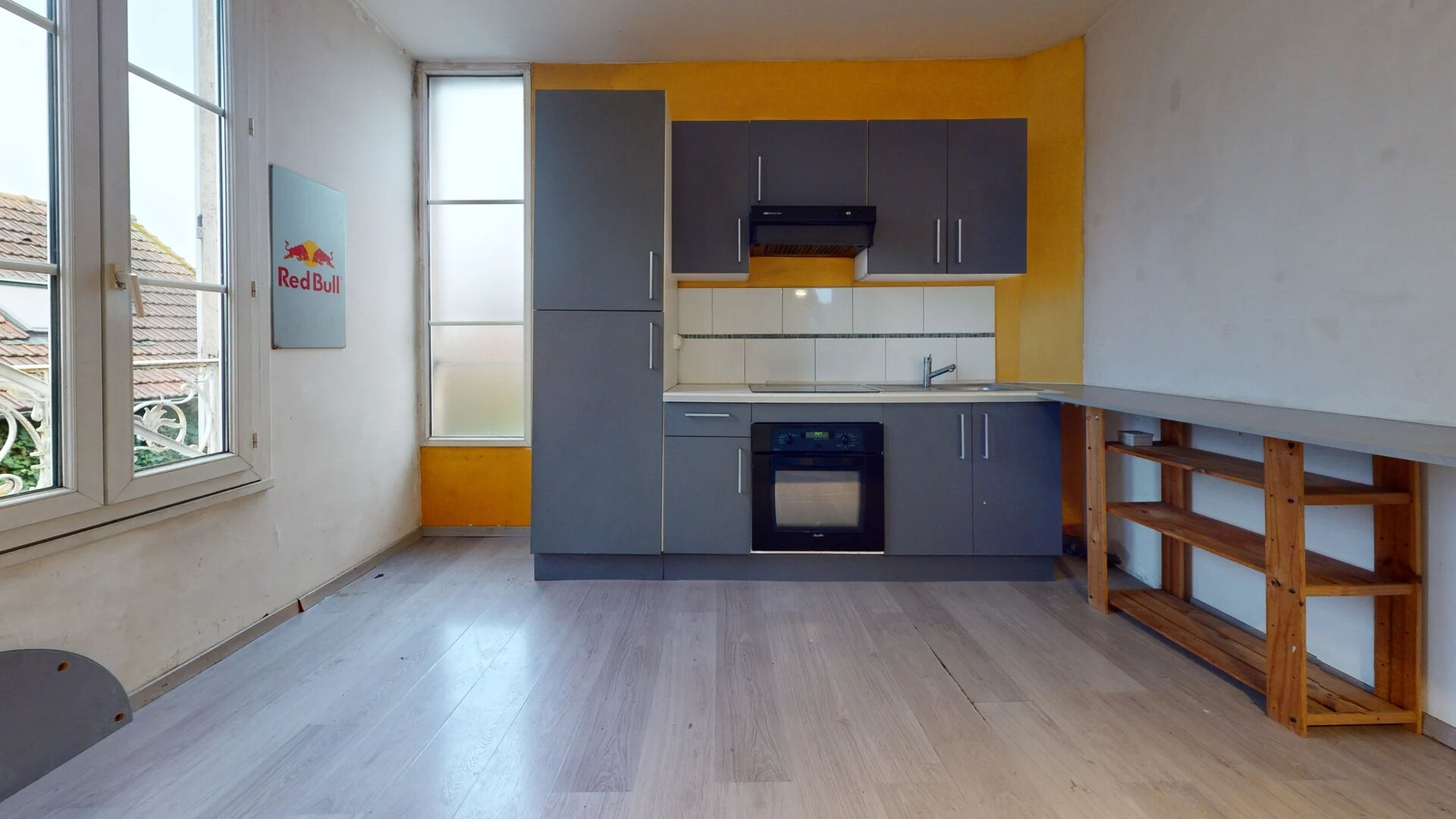 1er étage : Cuisine aménagée, salle d'eau, espace de vie.