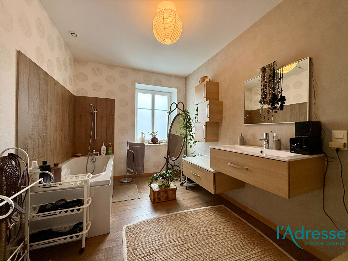 À l'étage : une grande pièce de vie avec cuisine équipée ouverte et salle à manger offrant volume et luminosité, une grande salle de bains, une chambre ainsi qu'un dressing pouvant également servir de chambre.
