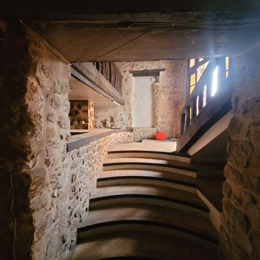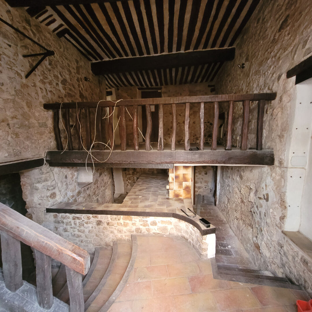 Il se compose  de deux pièces principales avec murs en  pierres  de 22.50m² et 23.95m², d'une pièce en mezzanine de 12.86m² , cuisine de 12.80m², plusieurs petites pièces annexes et un four à pizza.