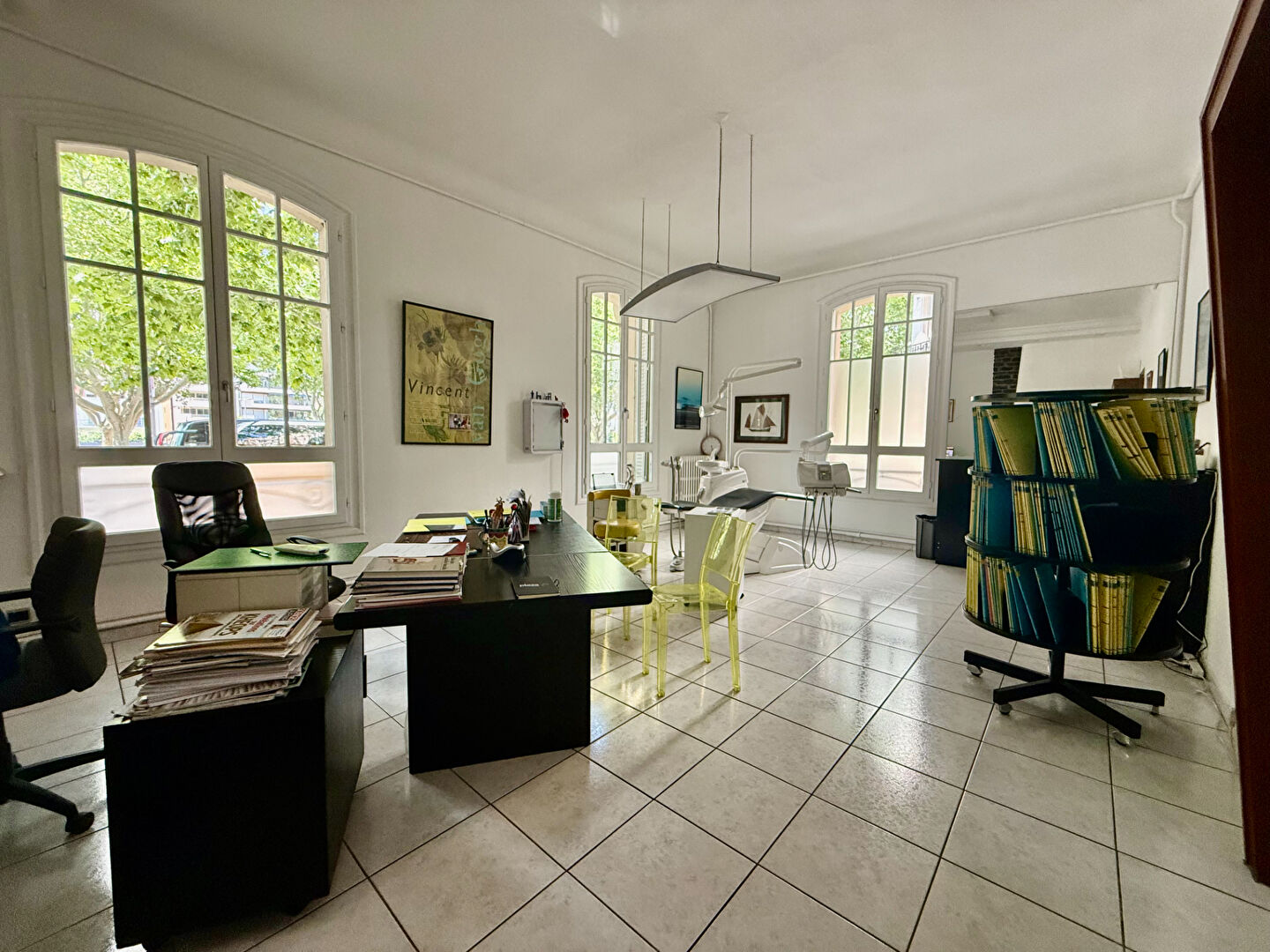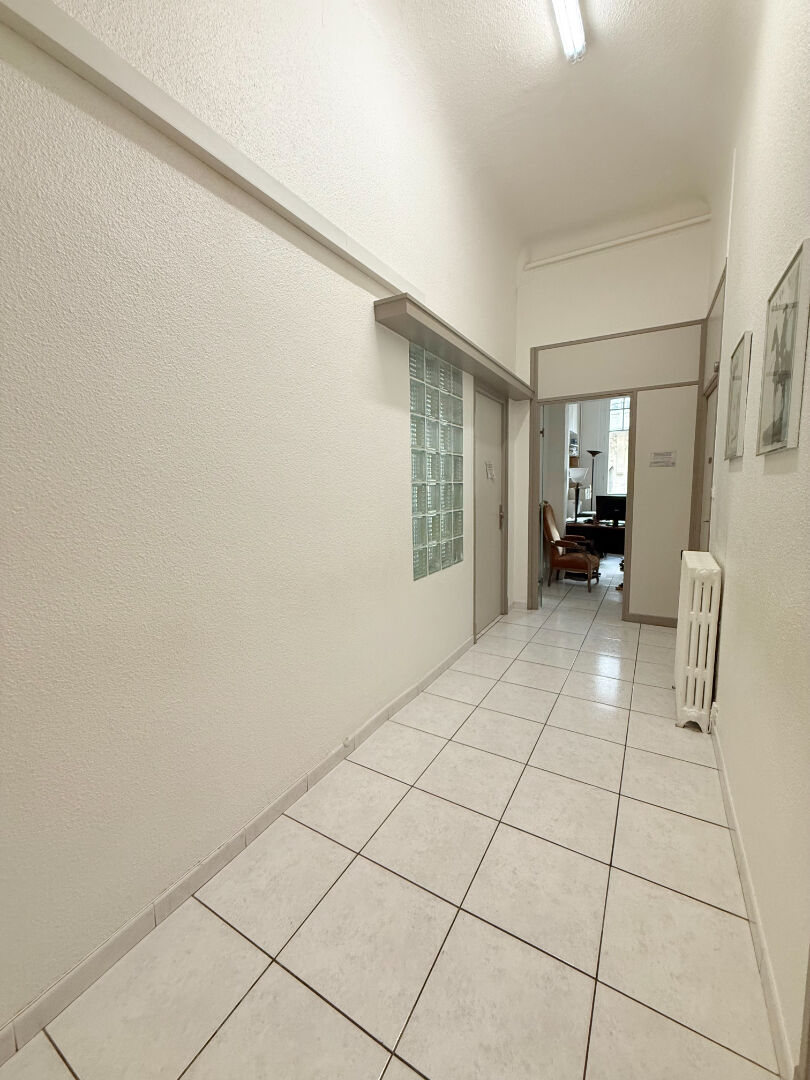 Un hall avec un dégagement qui dessert une salle d'attente avec wc, 3 bureaux, une cuisine avec cellier, donnant accès à une cour privée et partagée,