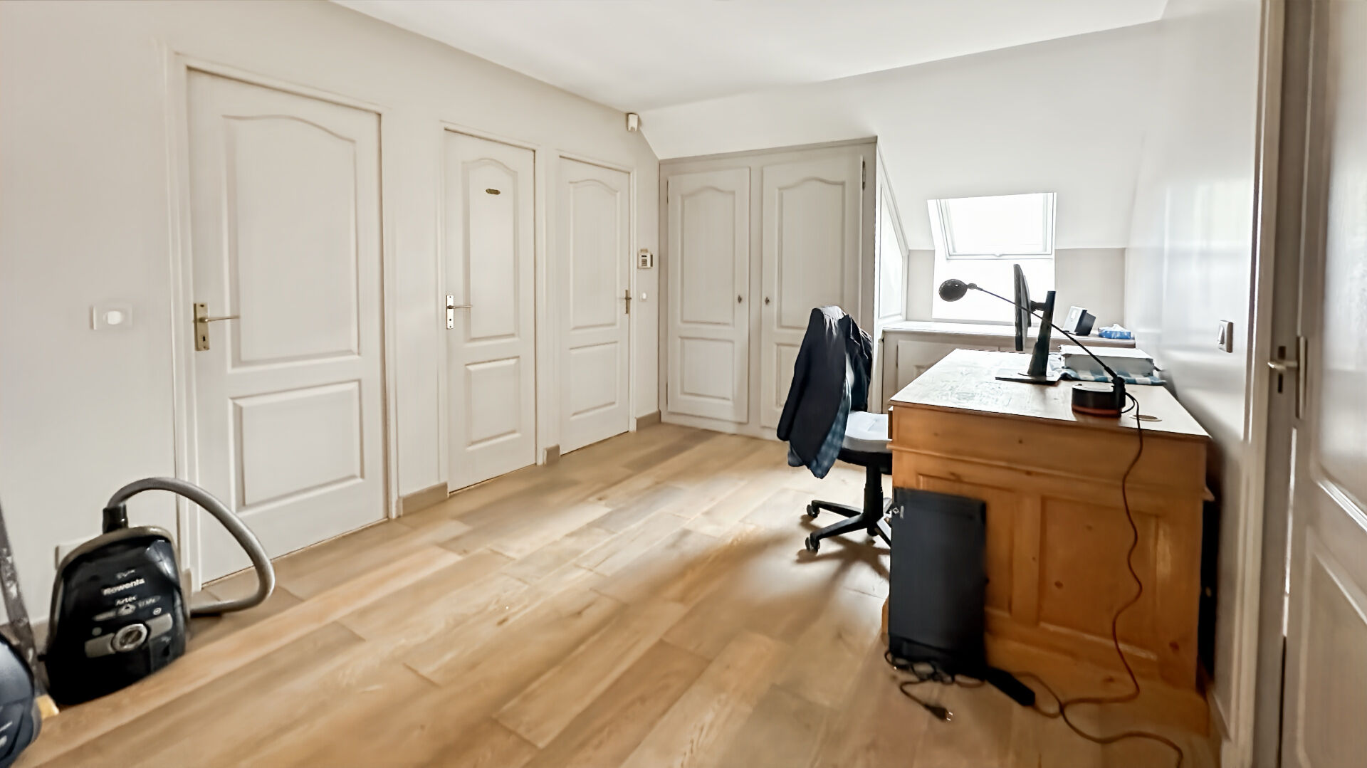 À l'étage : un grand palier pouvant accueillir un espace bureau dessert trois chambres, dont une de plus de 24 m² avec dressing, une salle de bains et un WC indépendant.