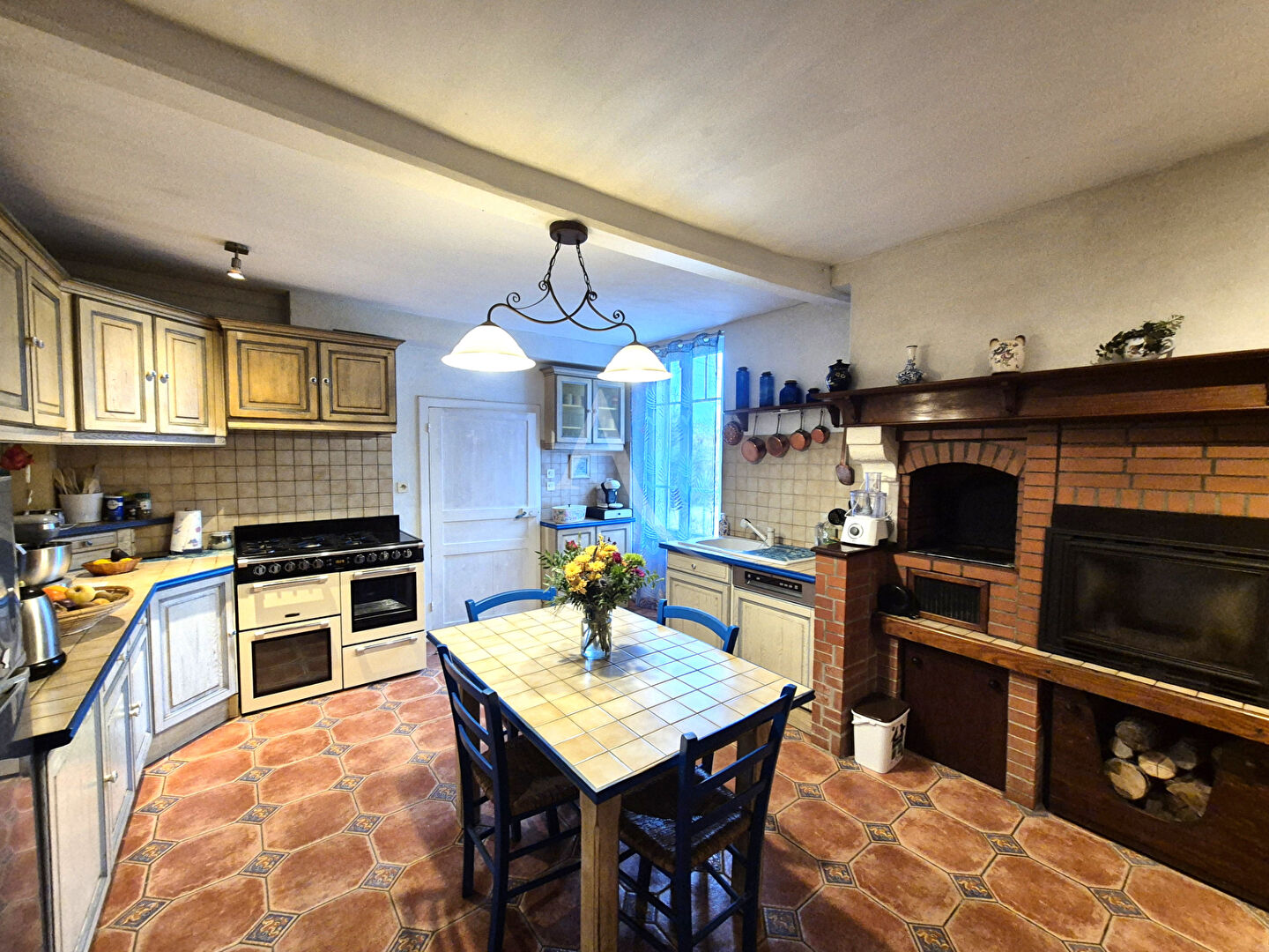 La cuisine aménagée et équipée de 18 m² pensée comme un véritable lieu de partage dispose d'un barbecue avec insert à bois intégré et d'un cellier conjuguant esthétisme et fonctionnalité.