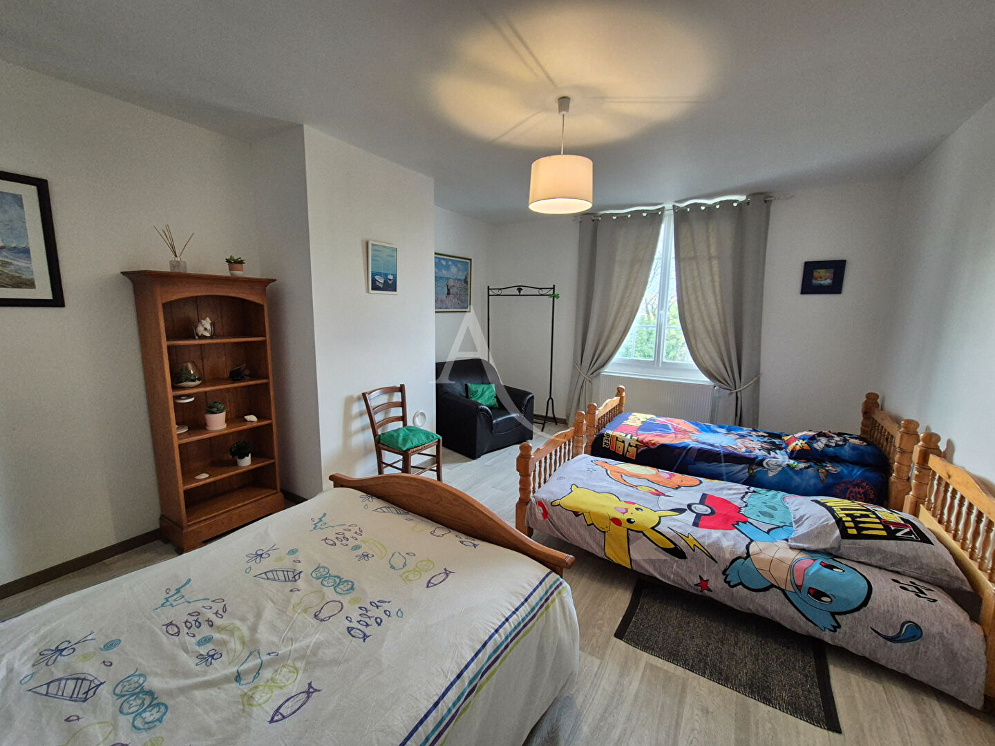 À l'étage, un palier distribue quatre chambres aux volumes remarquables d'environ 14, 16 et 21 m², une salle d'eau, un WC indépendant, un local technique et un accès aux combles aménageables offrant de nouvelles perspectives d'aménagement selon vos projets.