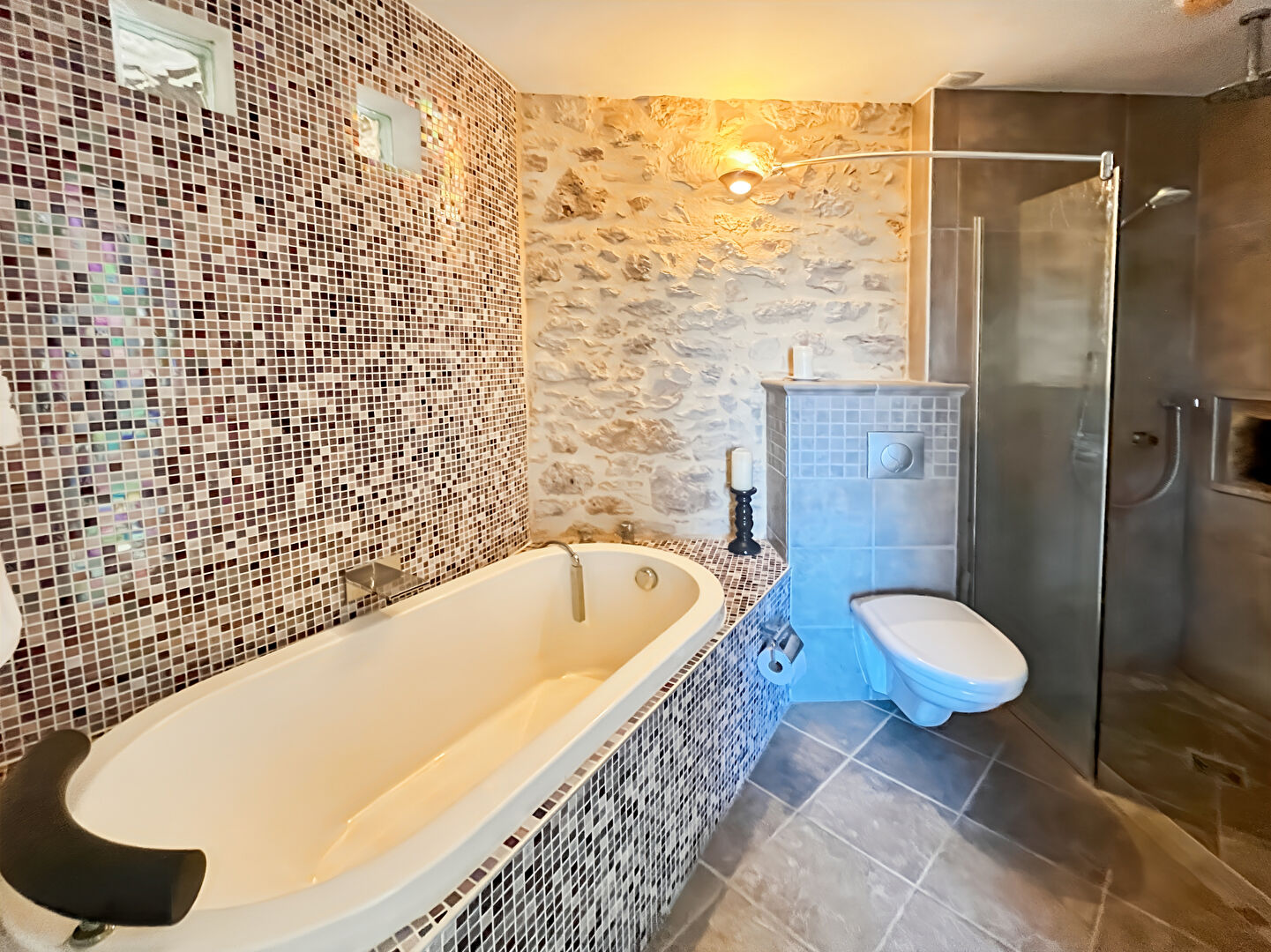 Un escalier en pierre vous mène à une belle terrasse couverte (bolet), puis à un grand séjour lumineux avec poêle à granulés et cuisine équipée ouverte, une salle à manger chaleureuse, une suite parentale confortable avec salle de bains complète (douche, baignoire spa, WC) et dressing.