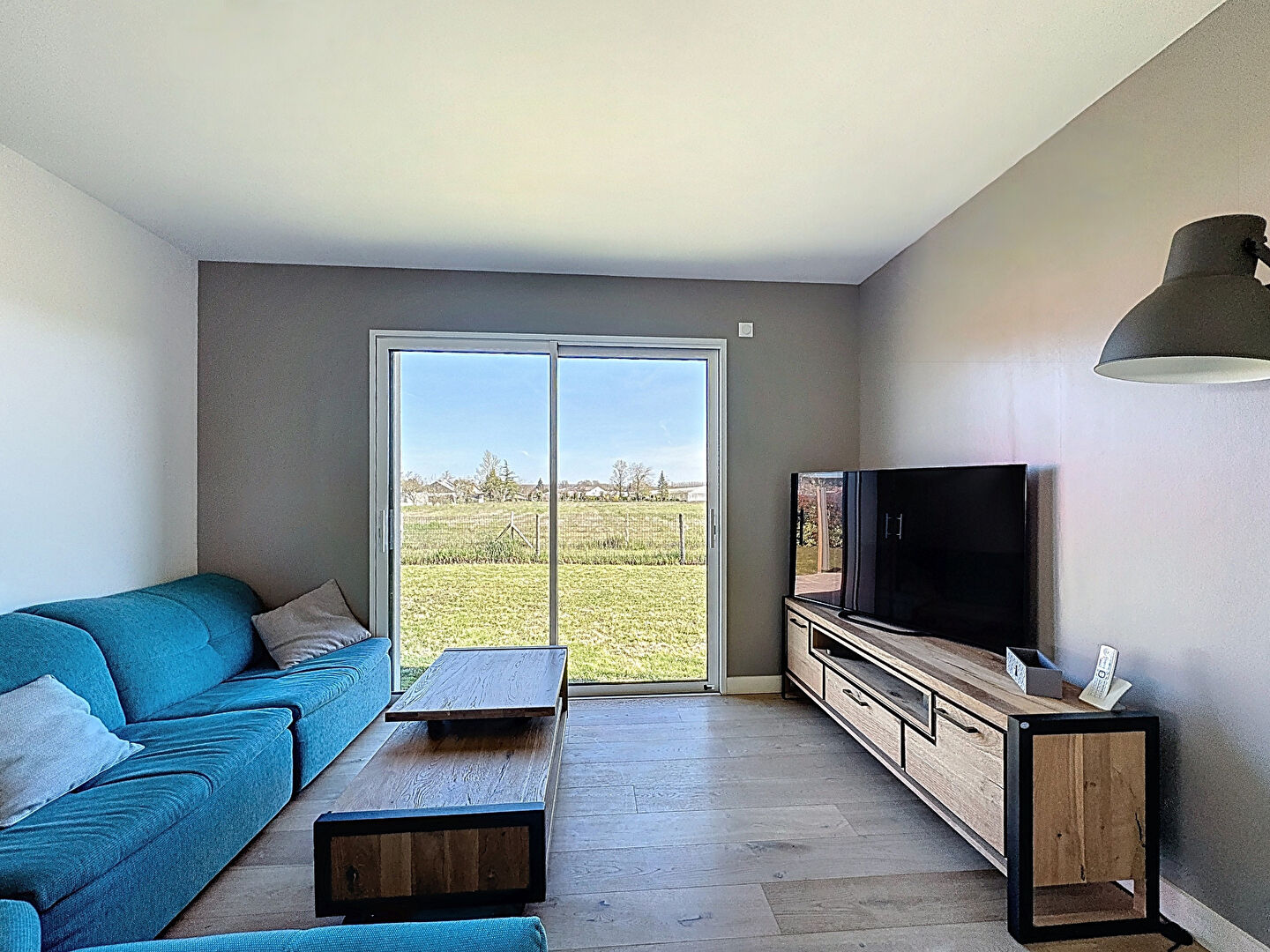 La pièce de vie, baignée de lumière, s'ouvre naturellement sur une terrasse et un jardin, offrant un cadre de vie agréable au quotidien.