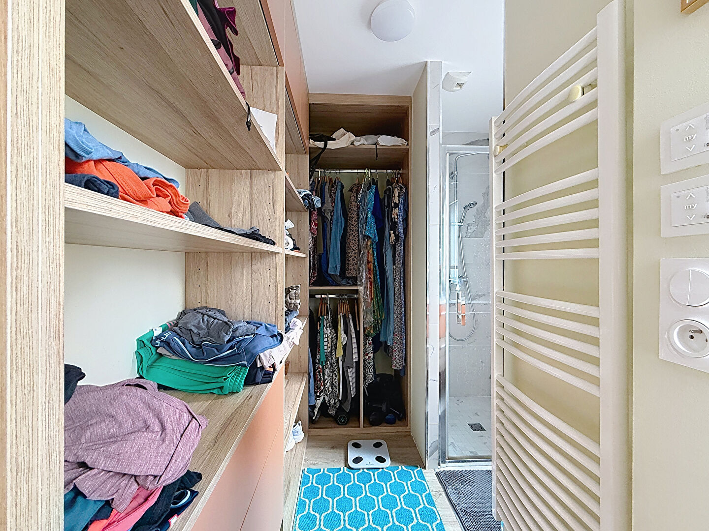 À l'étage, une mezzanine pouvant faire office de bureau dessert deux chambres avec rangements, une salle de bain avec douche et des WC indépendants.
