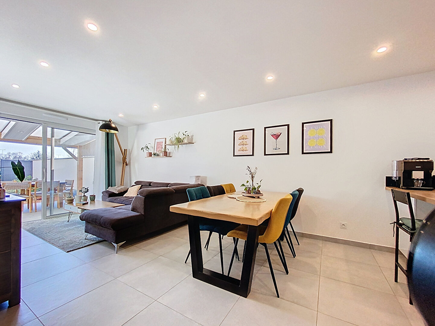 Un appartement T3 en rez-de-chaussée 74m² composé d'une entrée avec verrière, d'une pièce de vie traversante avec cuisine ouverte entièrement aménagée et équipée, de deux chambres avec placard, d'une salle d'eau avec douche italienne et d'un wc. En annexe, un garage boxé avec porte motorisée. La pièce de vie donne sur une terrasse couverte et un jardin de ville paysagé. Accessibilité PMR.
