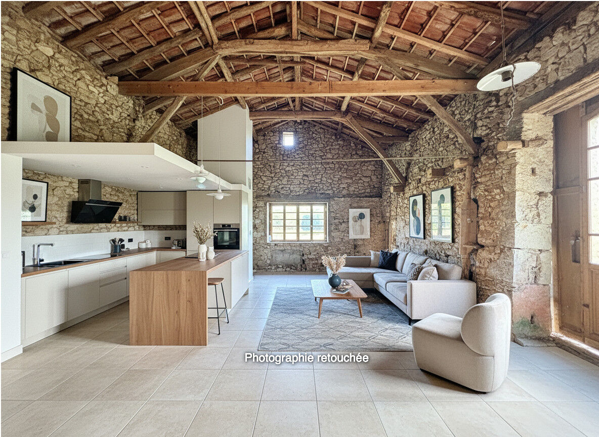 Découvrez ce magnifique ensemble, comprenant une maison et une grange en pierres, situé sur un terrain arboré de 6000 m² offrant un cadre paisible et naturel. La grange présente un potentiel exceptionnel d'environ 75 m² idéal pour la création d'un gite, complétée par un local chaudière attenant de près de 51 m². La maison, au rez-de-chaussée, se compose d'une spacieuse cuisine aménagée d'environ 16 m², d'une arrière-cuisine, d'un double séjour lumineux avec poêle à bois d'environ 53 m², ainsi que d'un WC et d'un cellier. À l'étage, vous trouverez trois grandes chambres, une salle d'eau moderne et un second WC. Les menuiseries en double vitrage assurent confort et isolation, tandis que l'assainissement collectif et la chaudière fioul garantissent des installations fiables. Pour le jardin, profitez de l'eau du Lot. Une opportunité à venir découvrir sans tarder !