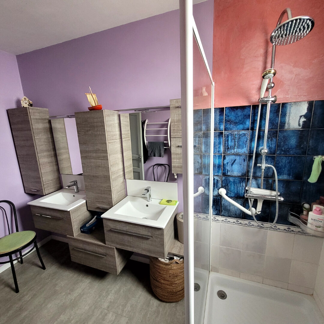 L'étage est composé d'un salon séjour spacieux, d'une cuisine meublée et équipée, de 2 chambres, d'une salle d'eau moderne avec double vasque et d'un WC.