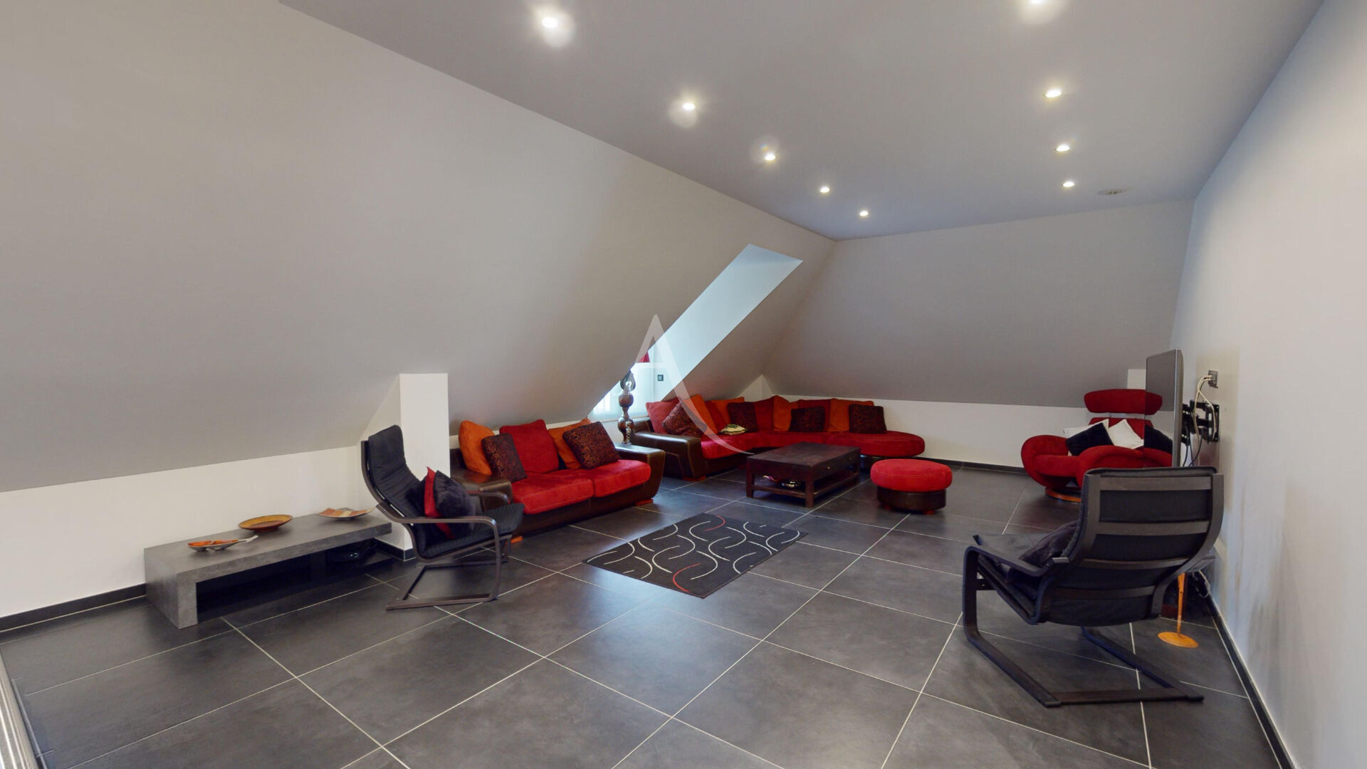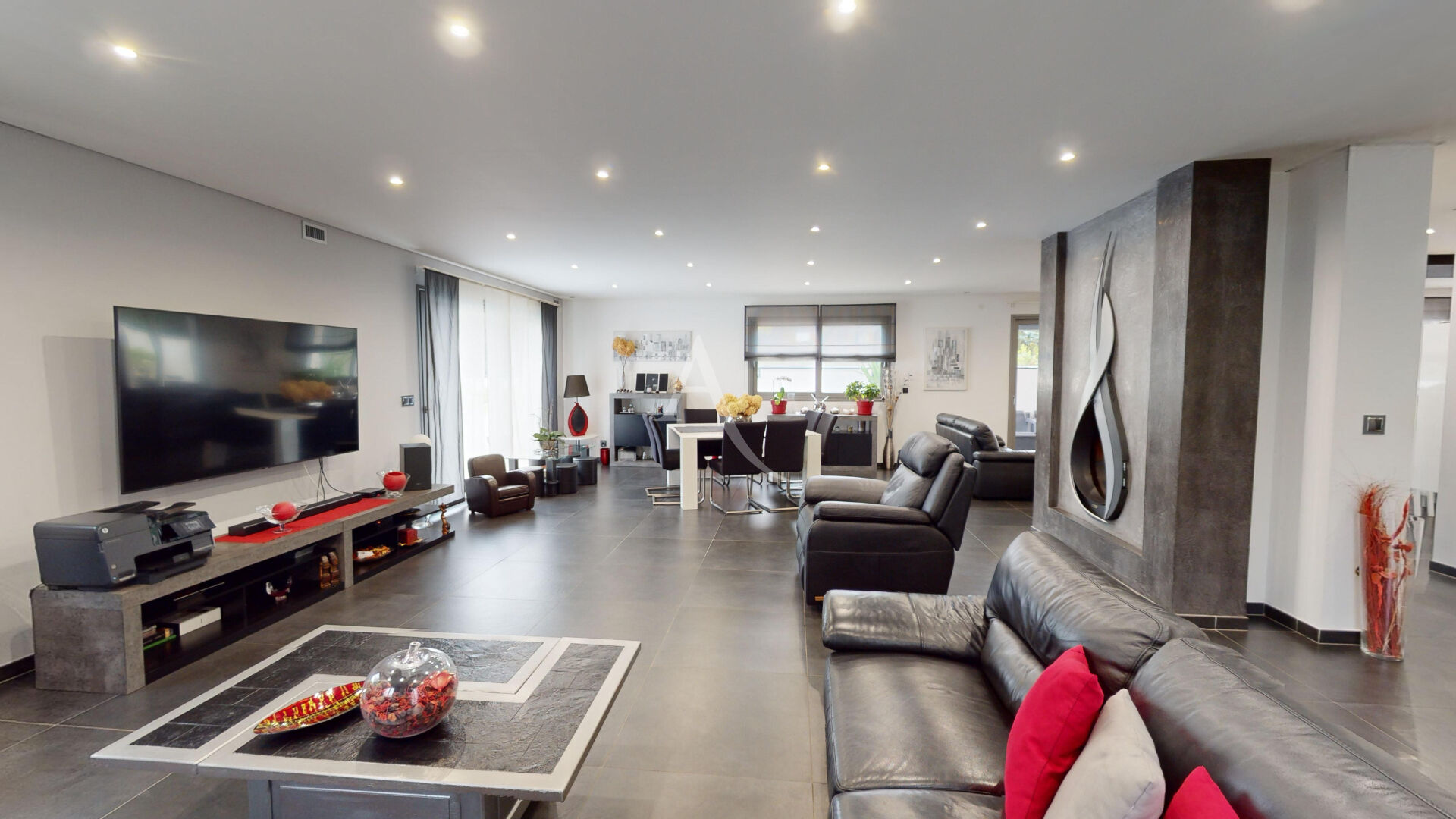 Au centre, une cheminée majestueuse crée une ambiance chaleureuse, sublimant ce triple séjour et triple exposition.