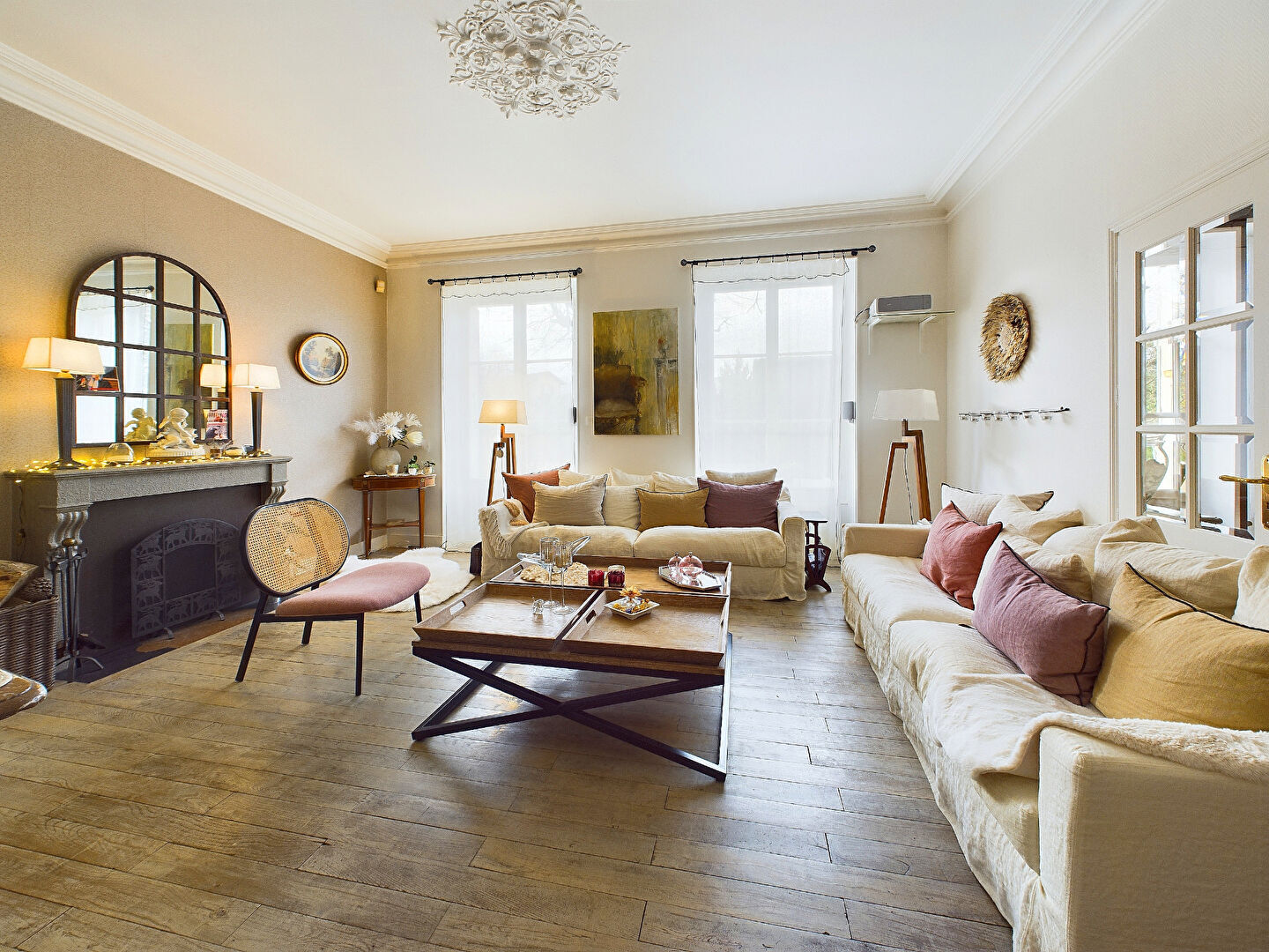 Le rez-de-chaussée s'organise autour d'un petit salon intime, d'un grand salon baigné de lumière, d'une salle à manger élégante et d'une cuisine équipée avec espace repas.