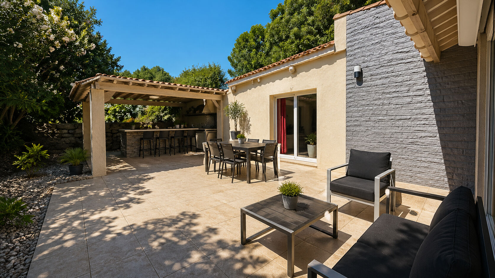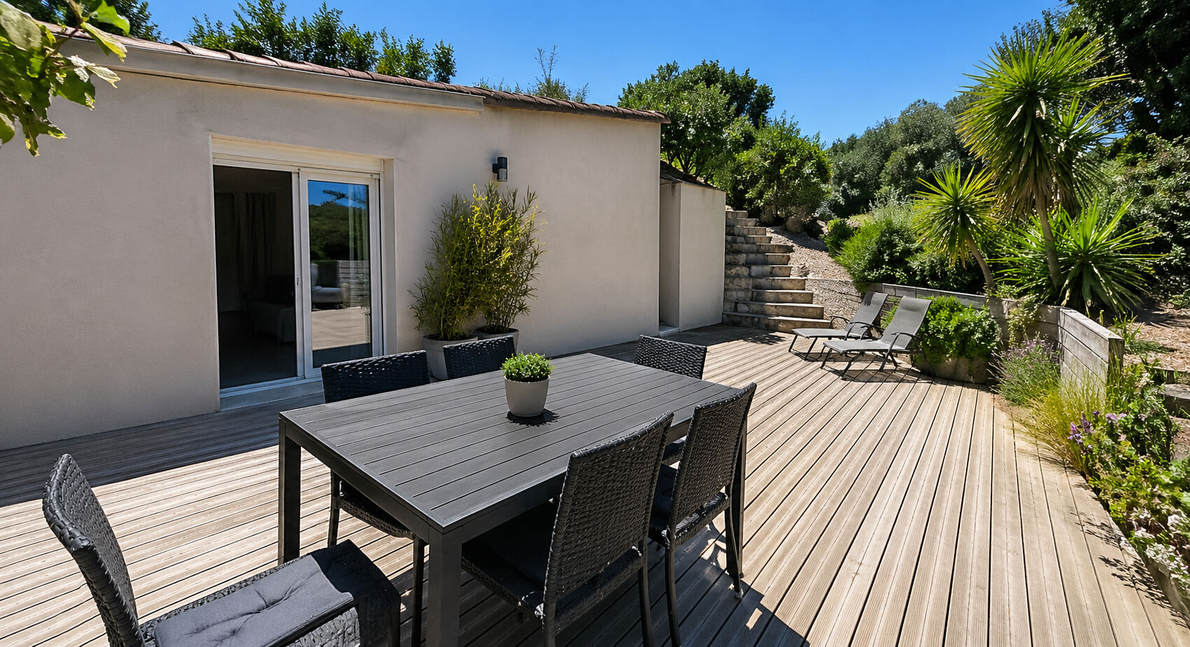 Les matériaux sont de qualités et les volumes sont généreux. La terrasse de la maison a une belle exposition sud et vue sur la verdure.
