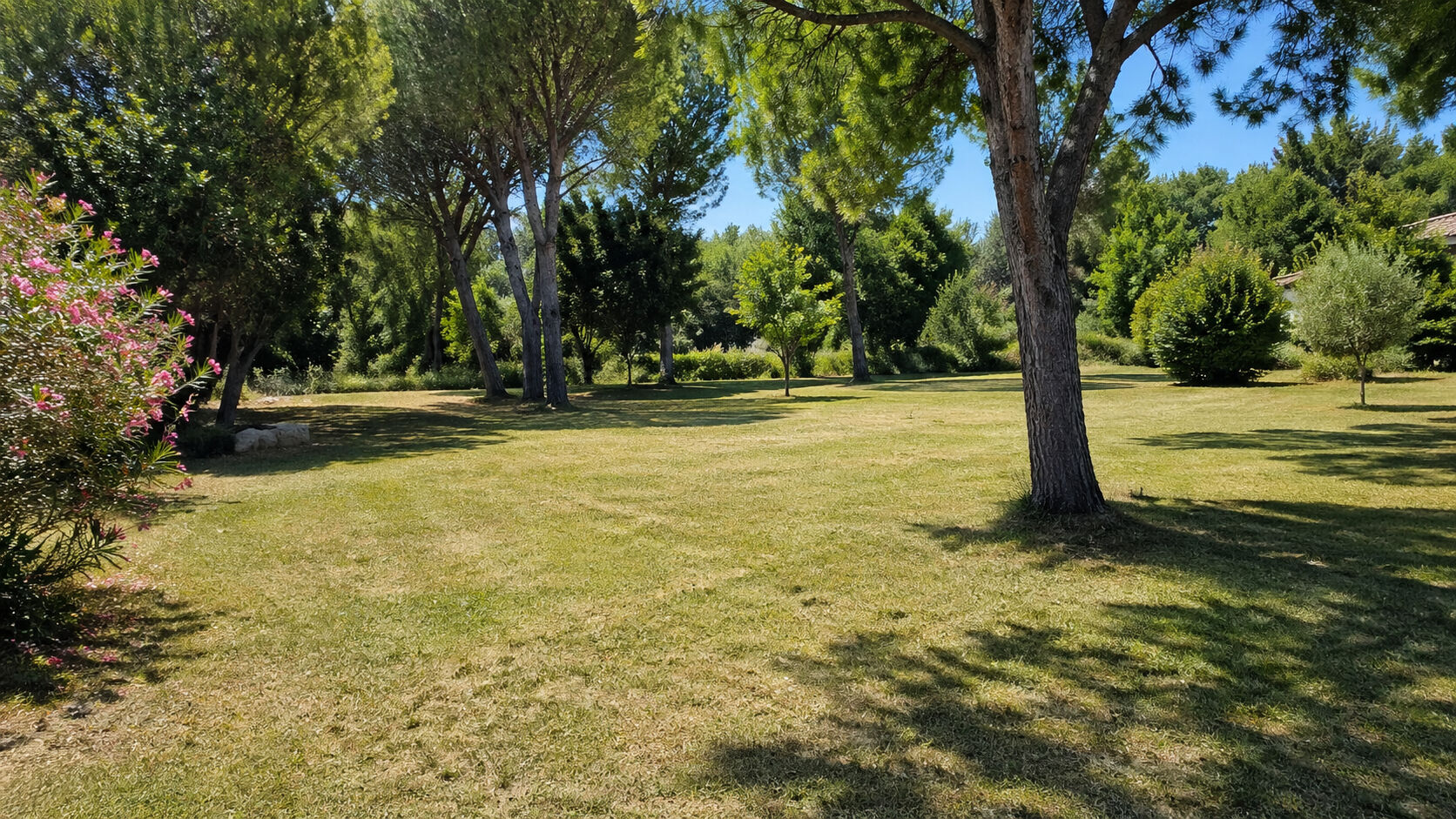 Le terrain offre une piscine et de beaux espaces de verdure.