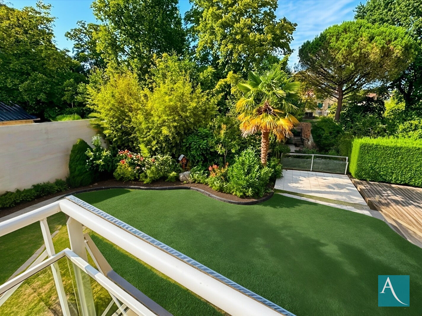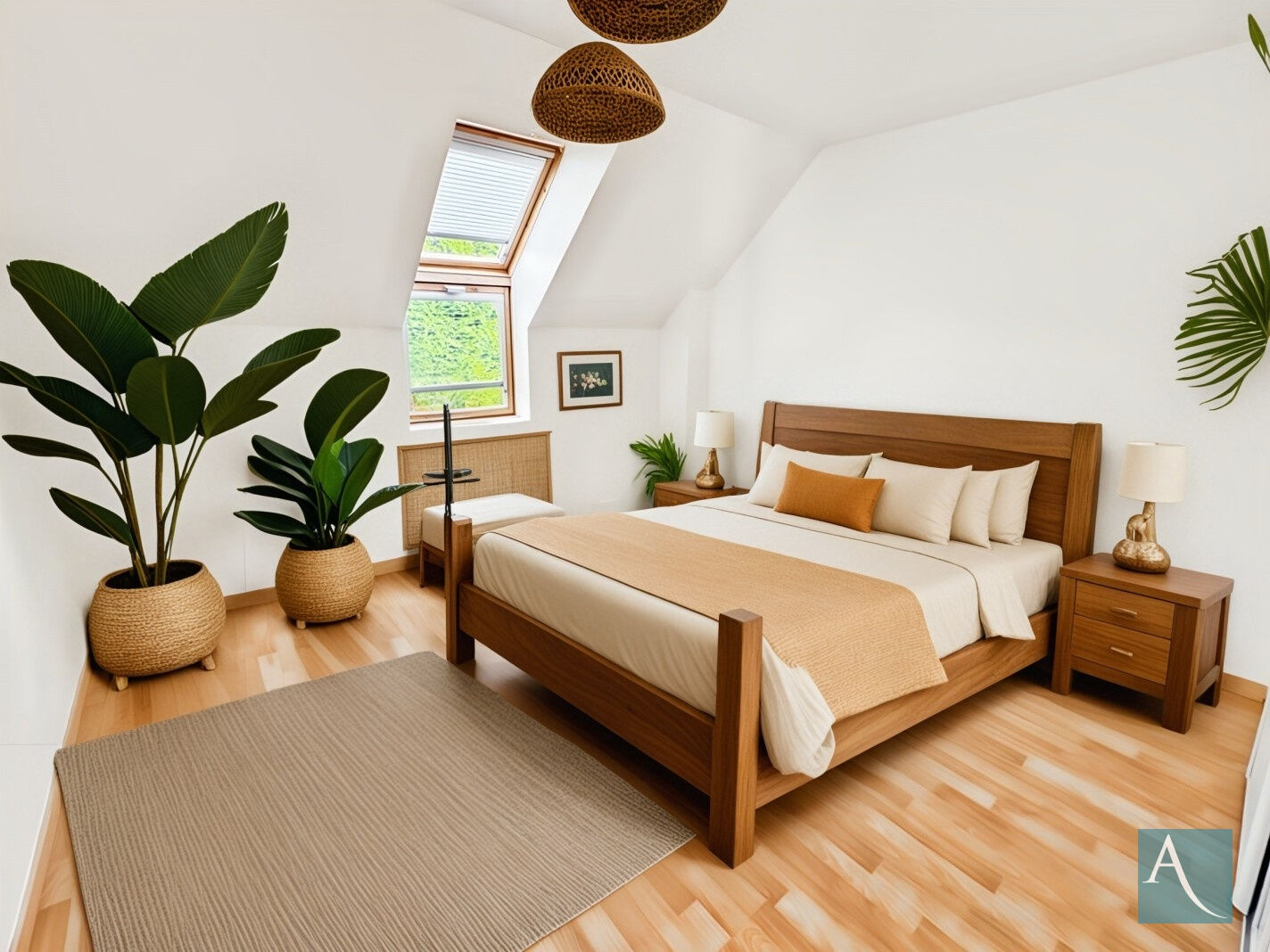 À l'étage, la suite parentale avec balcon privatif surplombe le jardin. Trois autres chambres, deux salles d'eau, des rangements intégrés partout.