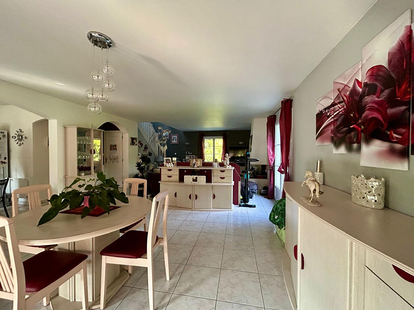 Elle s'ouvre sur un vaste séjour lumineux de 45 m² avec cheminée, un espace chaleureux et convivial, idéal pour recevoir. Ce dernier donne directement accès à une grande terrasse, parfaite pour profiter du calme environnant.