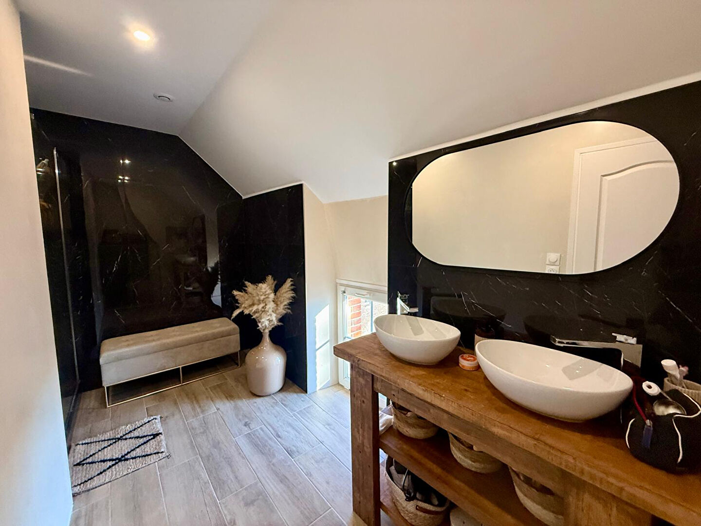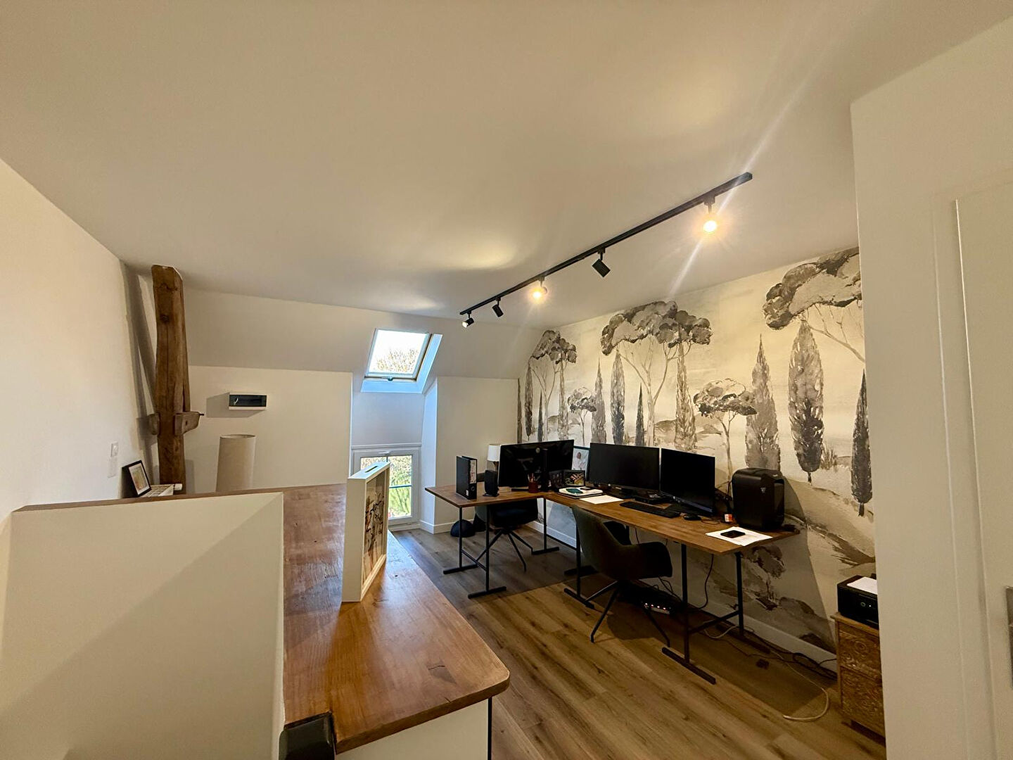 Le deuxième étage propose un palier pouvant accueillir un espace bureau ainsi qu'une suite parentale composée d'un dressing, d'une salle d'eau et d'un WC séparé avec vasque.