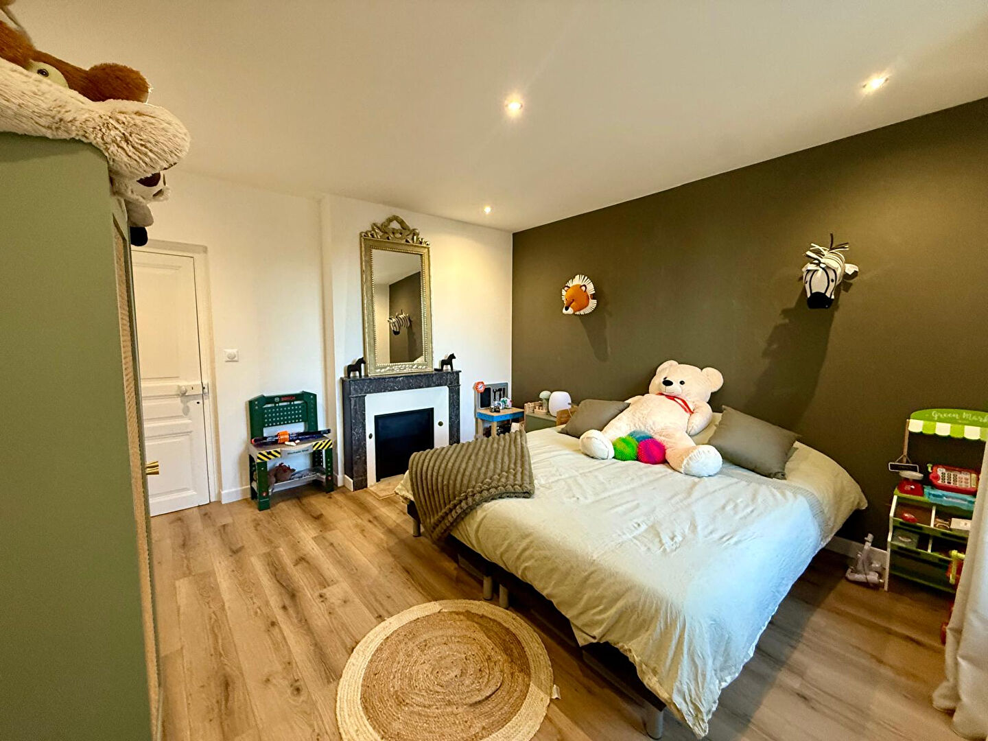 Au premier étage, une spacieuse pièce palière dessert deux belles chambres, un espace salle de jeux, une salle de bains et un WC indépendant.