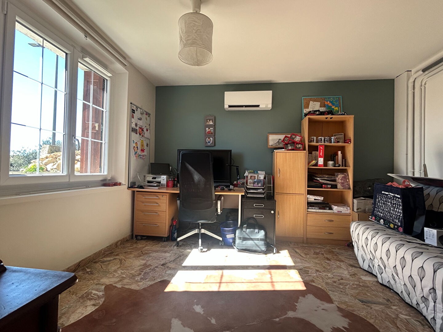 Dès l'entrée, le rez-de-chaussée accueille un espace bureau idéal pour le télétravail ainsi qu'un accès direct à un garage d'environ 40 m², apportant un vrai confort au quotidien.