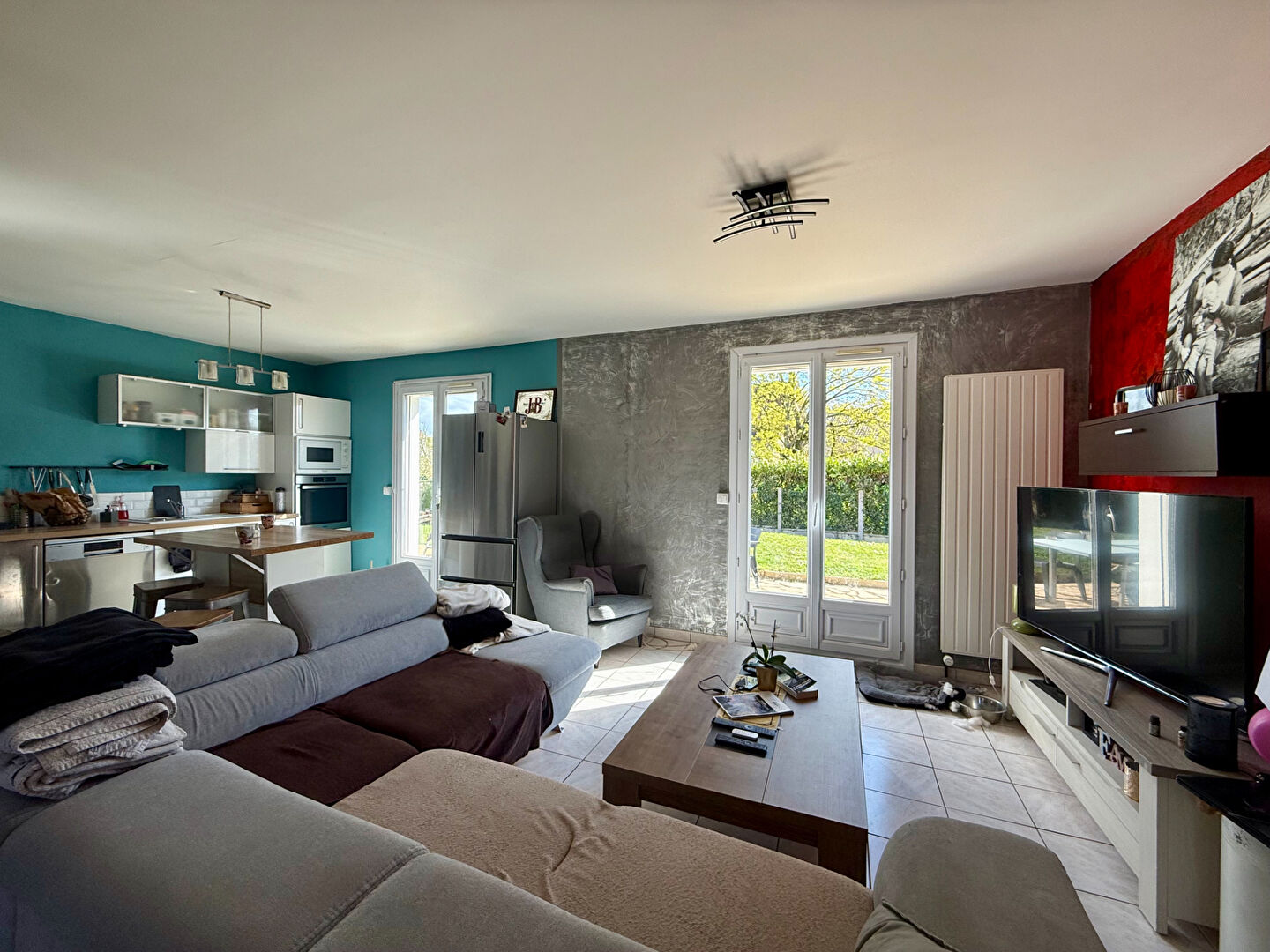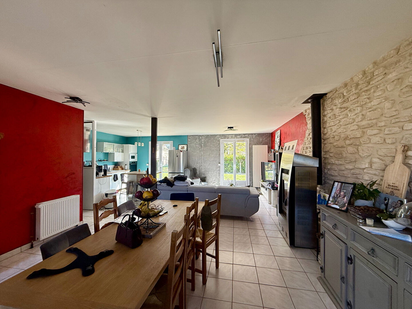 Elle offre une grande pièce de vie traversante avec salon salle à manger, cuisine ouverte et poêle à bois.
