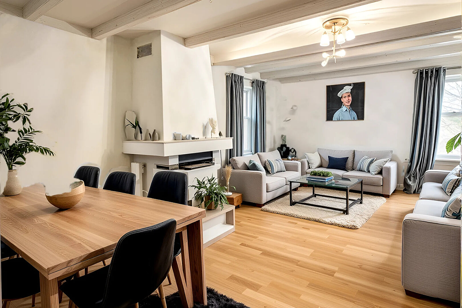 Elle se compose d'un séjour équipé d'une cheminée et d'une climatisation, idéal pour un confort optimal toute l'année. La cuisine est séparée, offrant un bel espace pour cuisiner au quotidien.