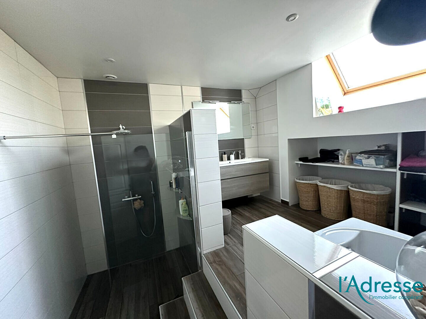 A l'étage : 4 chambres spacieuses Une grande salle de bain avec douche italienne et baignoire ; des WC séparés.