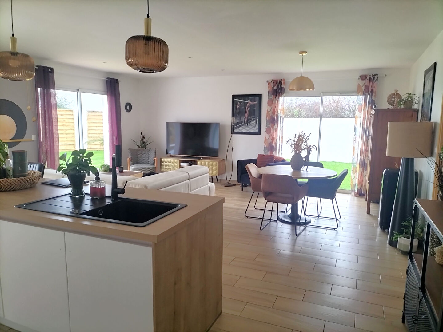 - Une vaste pièce de vie lumineuse avec une cuisine américaine aménagée et équipée, pour des moments conviviaux.