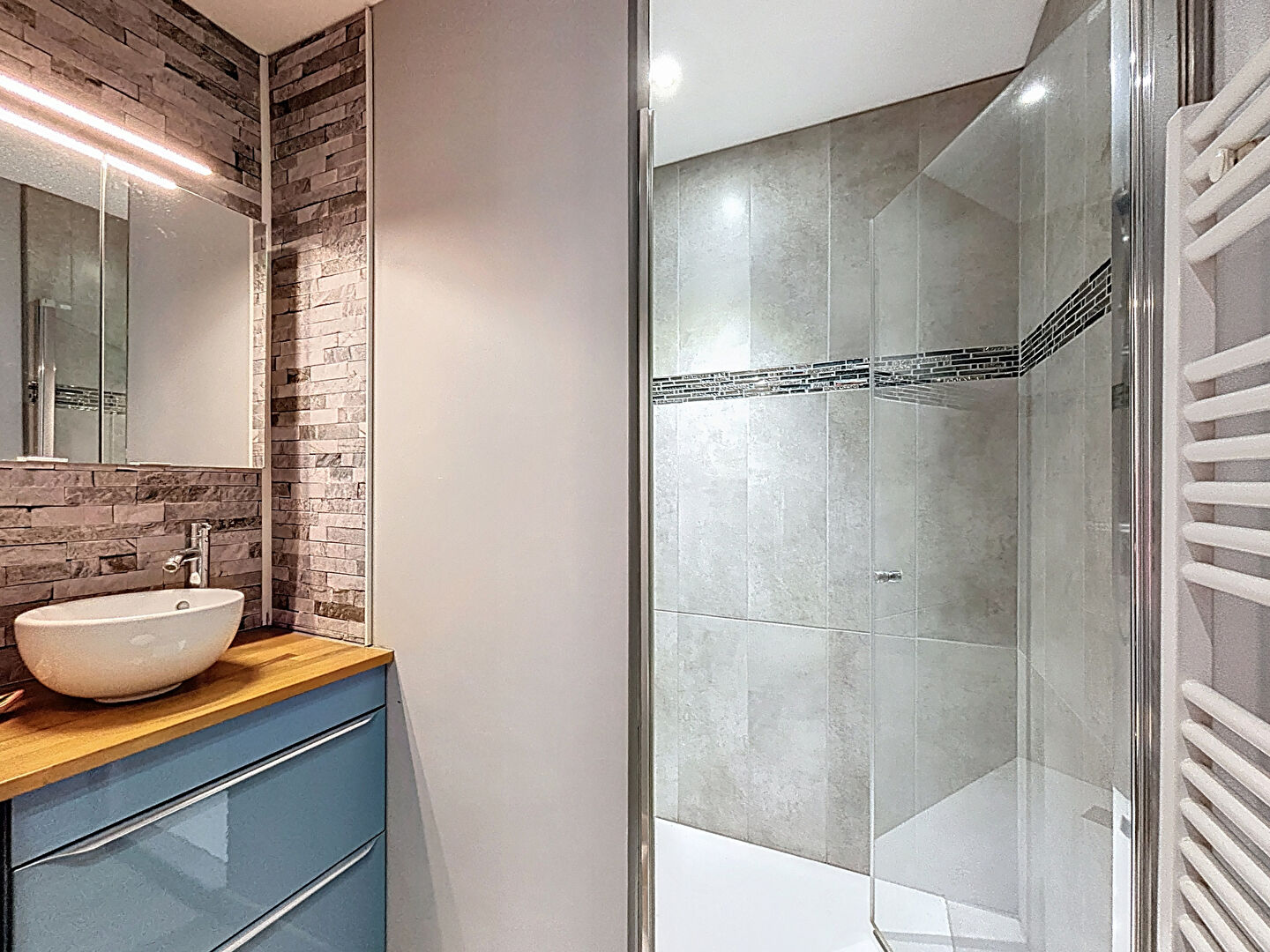À l'étage, le palier dessert deux chambres sur parquet, toutes deux équipées de placards coulissants, ainsi qu'une salle d'eau moderne.