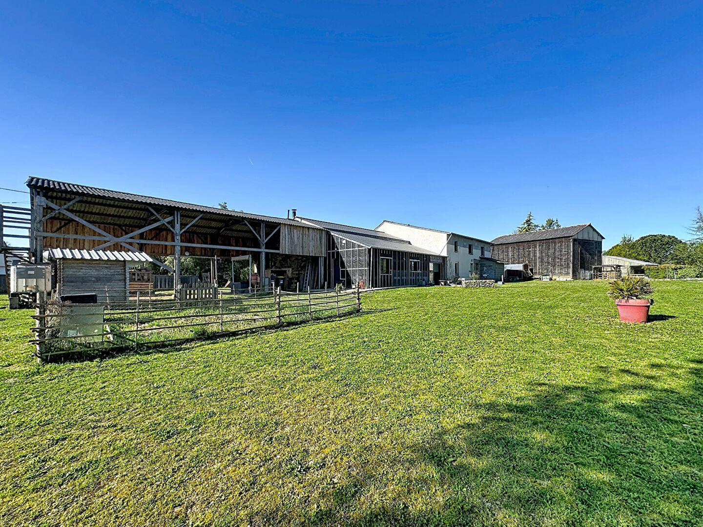 Le terrain d'environ 5000 m² offre un bel espace extérieur où chacun peut profiter de la nature et du calme environnant. Plusieurs dépendances viennent compléter l'ensemble : un garage, un hangar et un ancien séchoir à tabac, autant de possibilités pour le rangement, les loisirs ou les projets personnels.