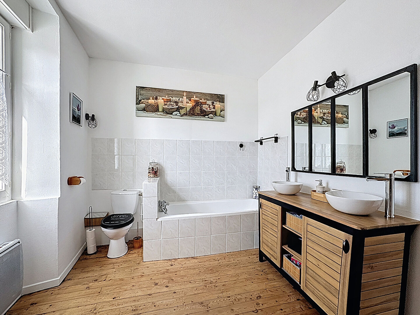 Deux chambres donnant sur une salle de bains avec WC, lumineuse et agréable puis une chambre pouvant devenir un bureau ou un dressing.