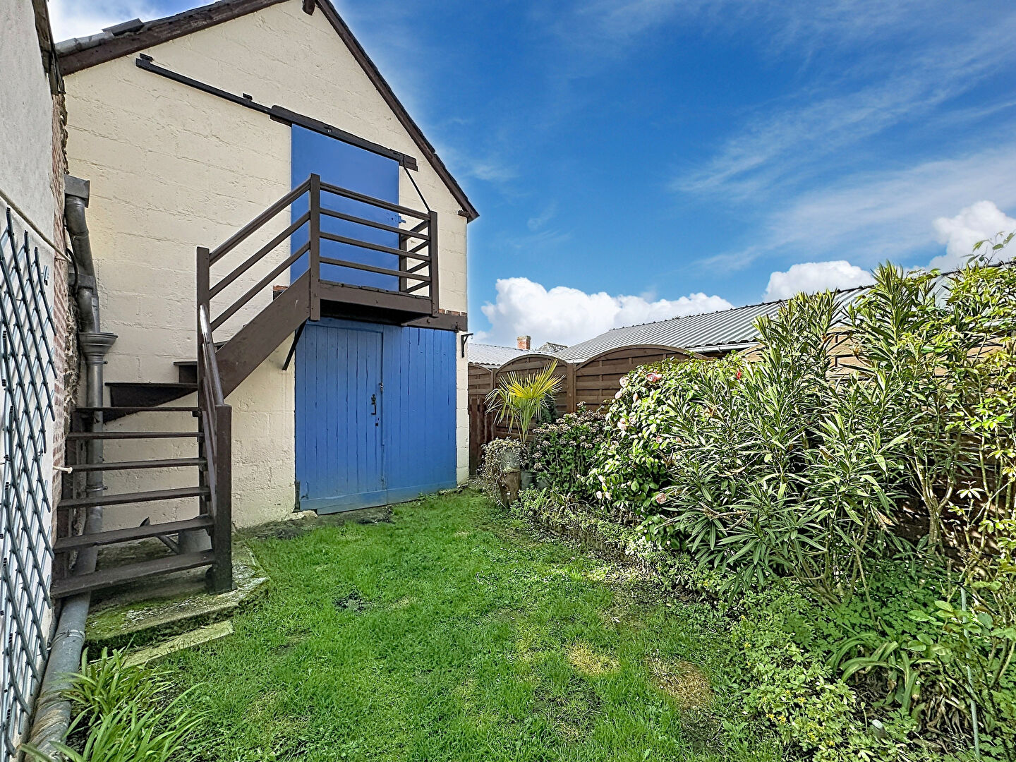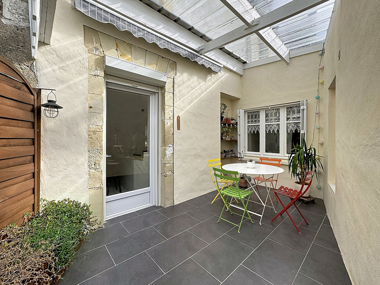 Une porte ouvre sur un patio intimiste, prolongé par une petite courette, parfaits pour profiter des beaux jours.