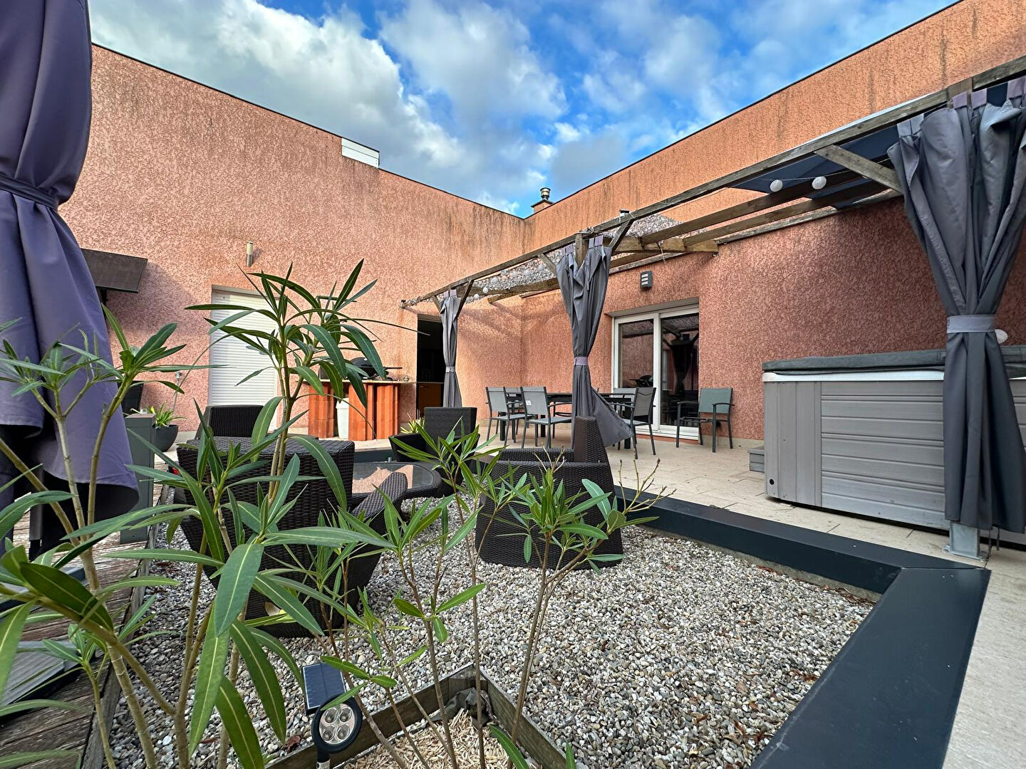 Côté extérieur, vous profiterez d'un patio avec terrasse ombragée et spa, ainsi que d'une terrasse bois qui recouvre déjà l'emplacement d'une future piscine dont la structure reste à finaliser. Le terrain arboré de 2 000 m², divisible et partiellement constructible, offre de belles perspectives d'évolution.