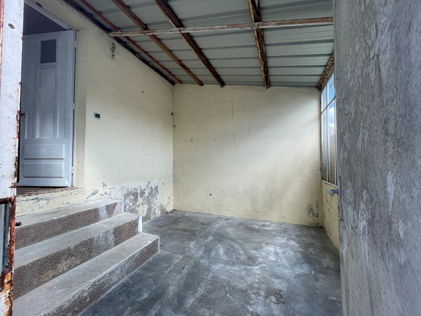 Petite maison comprenant pièce principale avec coin cuisine, chambre, dégagement desservant salle d'eau, wc, bureau et une verrière.