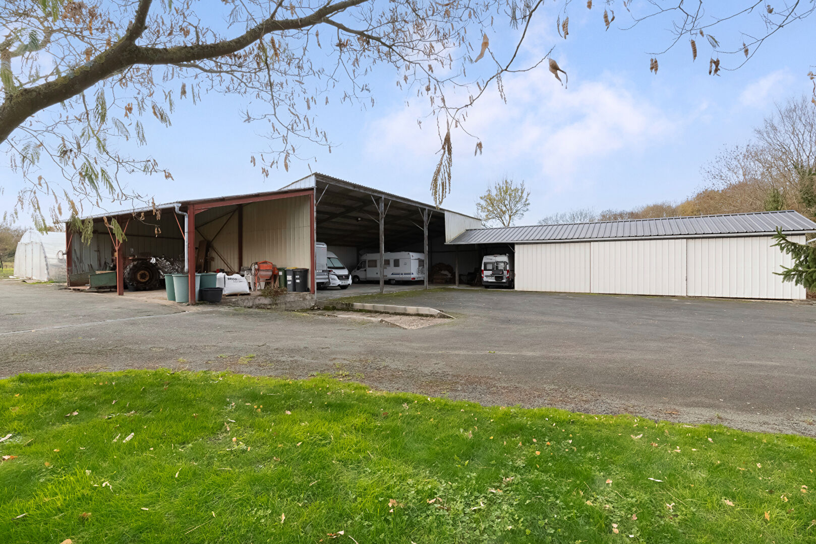 L'ensemble de la propriété profite d'un terrain de plus de 3 hectares agrémenté de plusieurs hangars pouvant accueillir matériels agricoles ou camping-car et d'une grande serre prête à l'emploi.