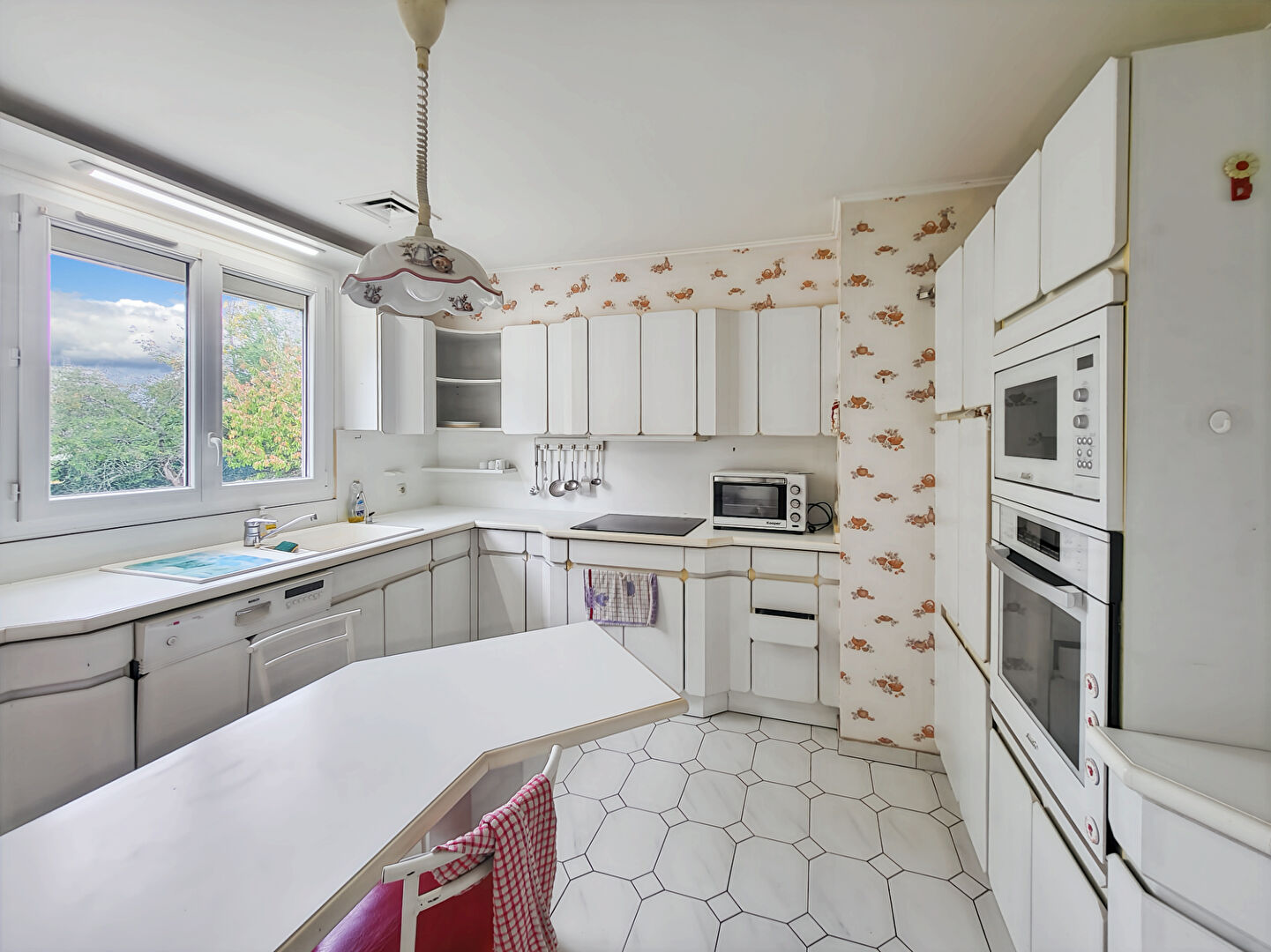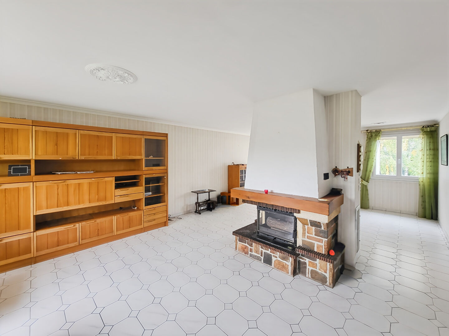 La maison dans un style des années 80/90 se compose d'une cuisine indépendante entièrement aménagée et équipée, d'un grand salon d'environ 40m² dont vous apprécierez également la présence d'une cheminée avec insert pour des soirées chaleureuses.