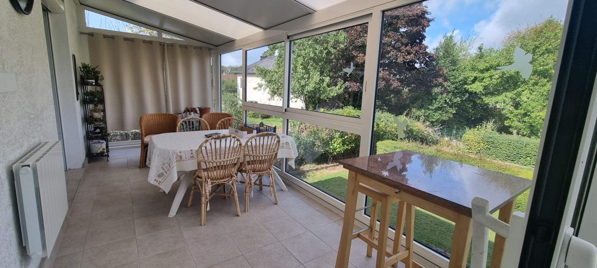une cuisine aménagée et équipée donnant sur une véranda lumineuse et une terrasse.