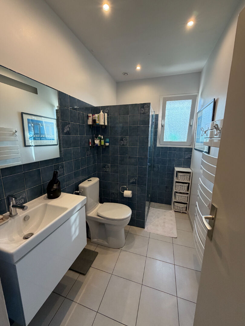 Un dégagement avec placards muraux dessert trois chambres, dont une avec dressing, une salle d'eau et une salle de bains avec WC.