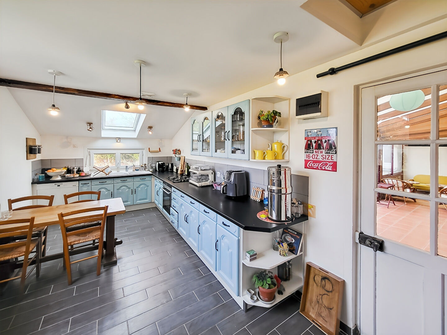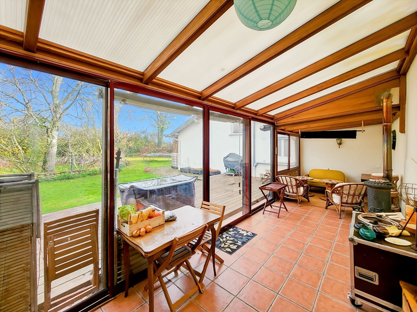 Vous découvrirez aussi une salle d'eau moderne avec WC, une chambre, une cuisine indépendante entièrement aménagée et équipée de 14m², prête à accueillir vos talents culinaires ainsi qu'une véranda avec son poêle à bois.