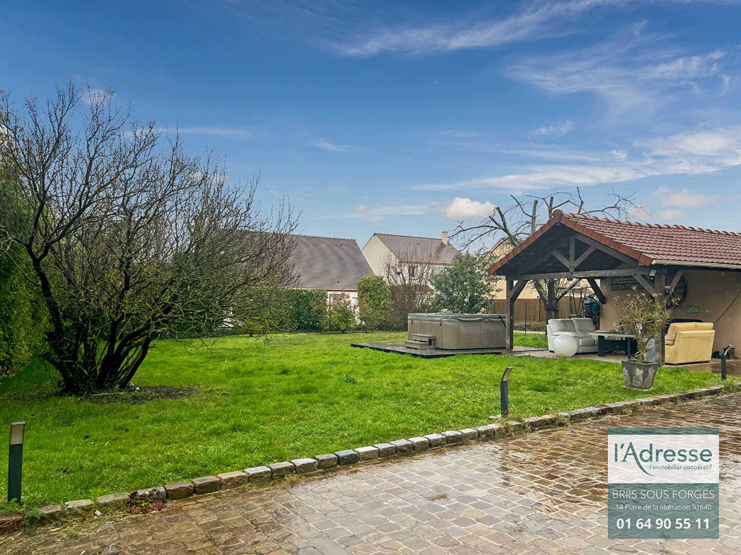 Côté extérieur, les prestations sont au rendez-vous : portail électrique, aire de stationnement en pavés, deux garages, terrasse couverte sous auvent, spa, jardin clos d'environ 1 000 m² avec puits.