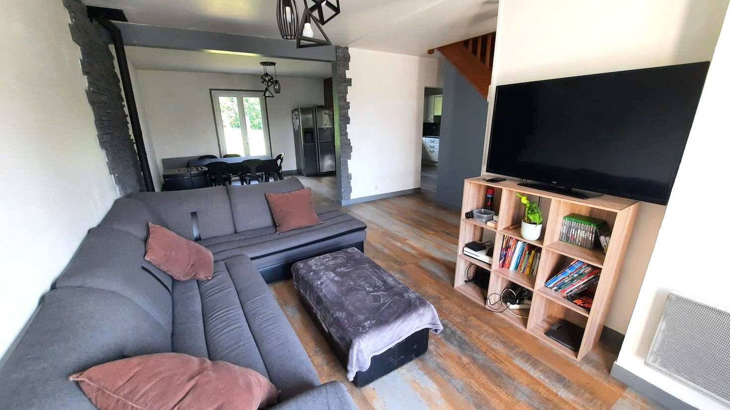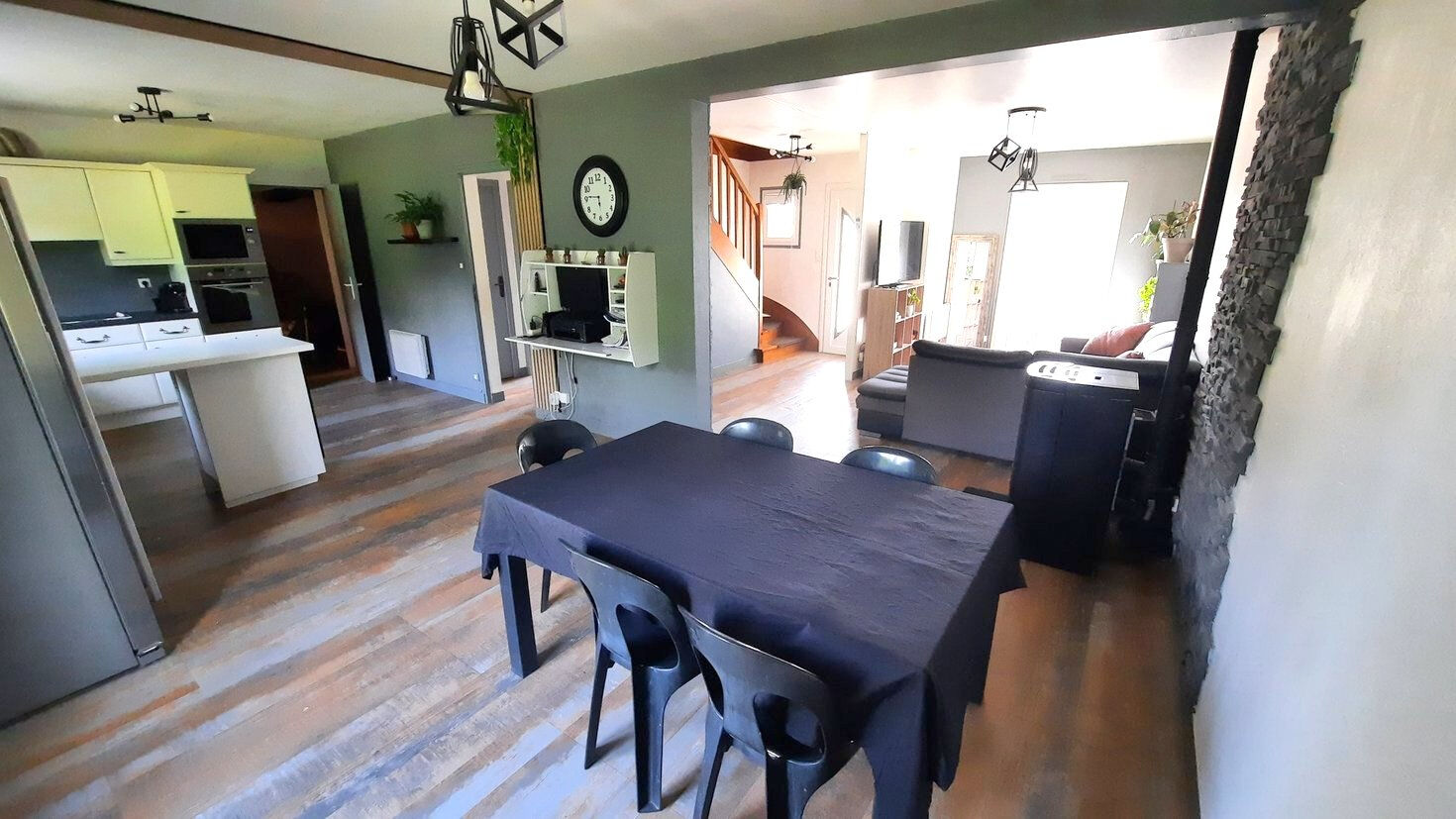 Au rez-de-chaussée, un vaste salon/séjour lumineux, agrémenté d'un poêle à granulés, s'ouvre sur une cuisine aménagée fonctionnelle. Vous y trouverez également une chambre cosy et des WC indépendants.