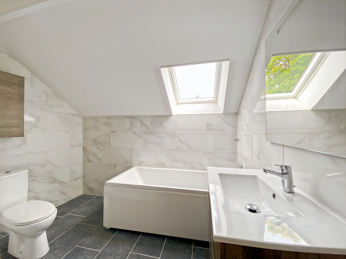 Dans les combles : superbe espace parental avec salle de bains et rangements.