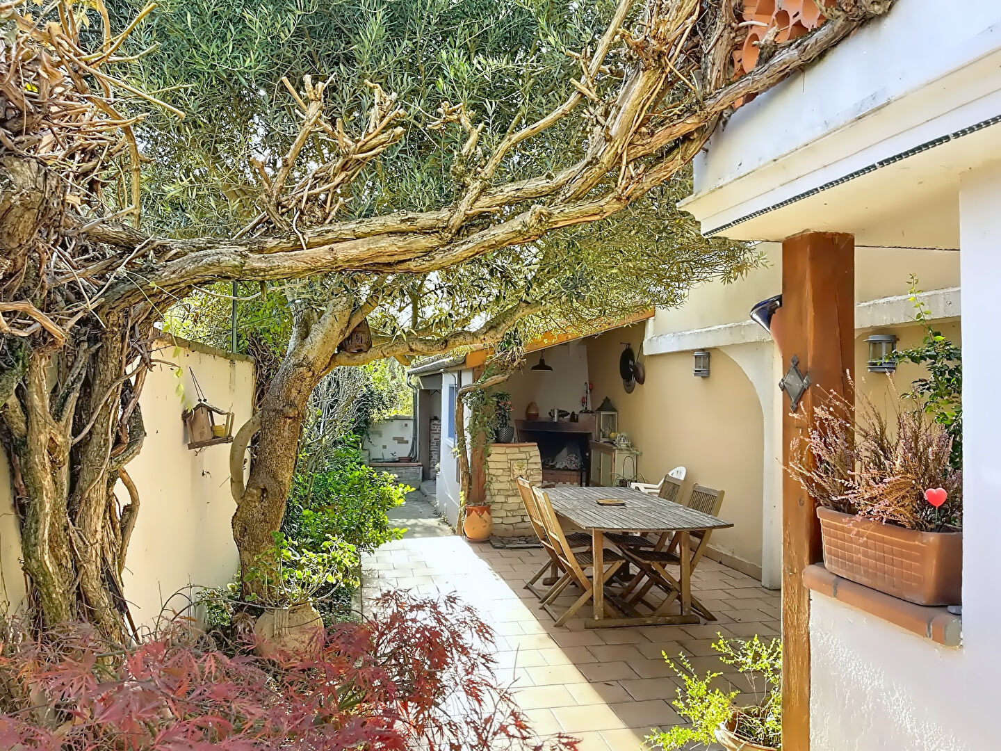 Des espaces pensés pour profiter pleinement : terrasse pour repas entre amis, cuisine d'été avec cheminée, jardin arboré et appentis/remise pour tout ranger.