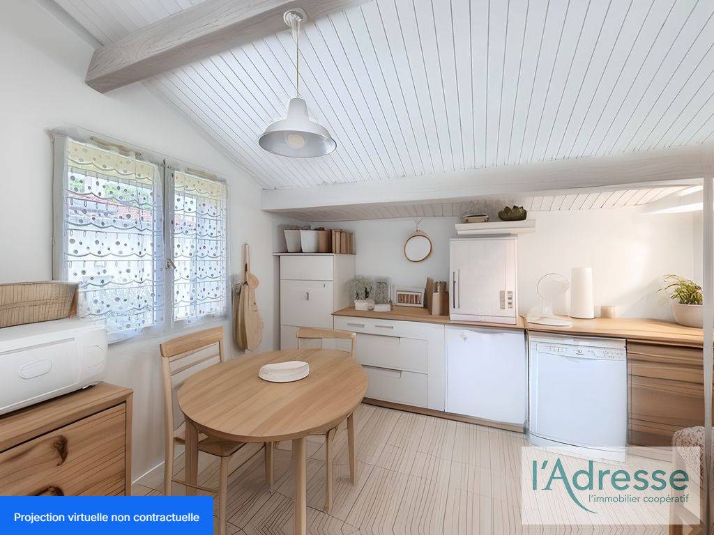 À l'étage : grande pièce de vie traversante avec cuisine équipée, véranda lumineuse, deux chambres, salle d'eau et WC séparé.