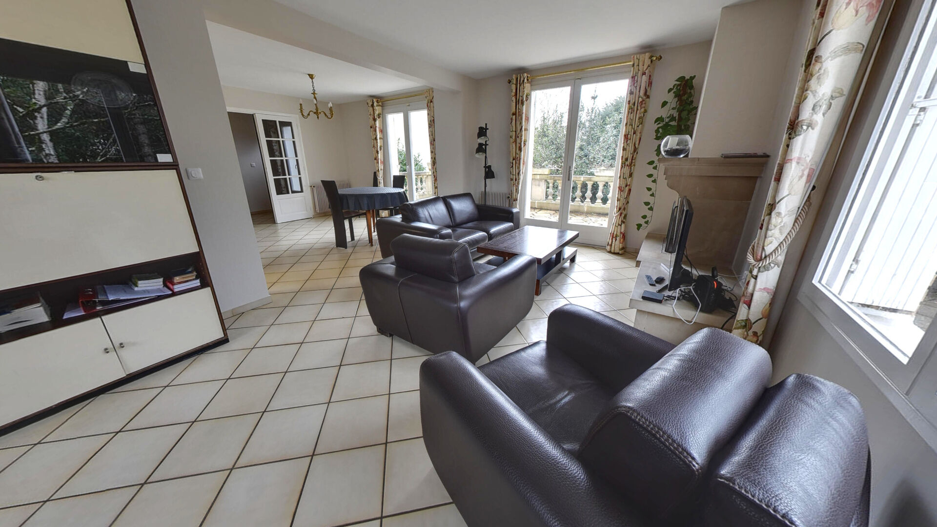 Cuisine conviviale et séjour double de 40m² avec cheminée ouvrant sur une spacieuse terrasse de 24m².