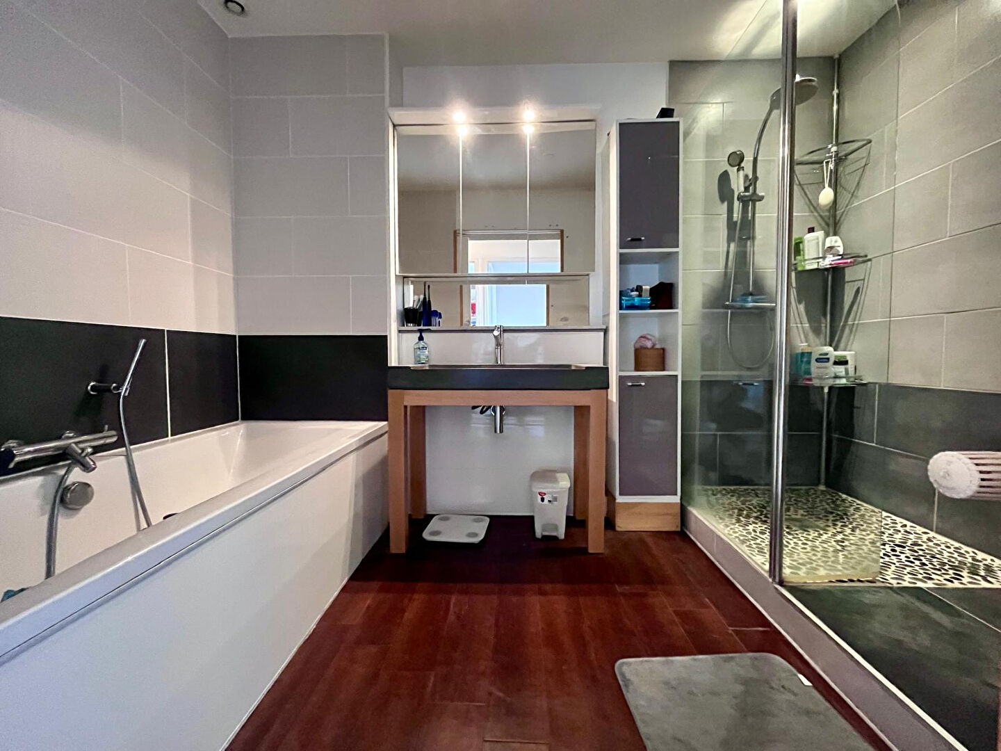 A l'étage, trois chambres dont une équipée d'un grand dressing sur mesure, la deuxième d'un grand placard. La salle de bains est équipée d'une douche et baignoire, séparé le deuxième w.c