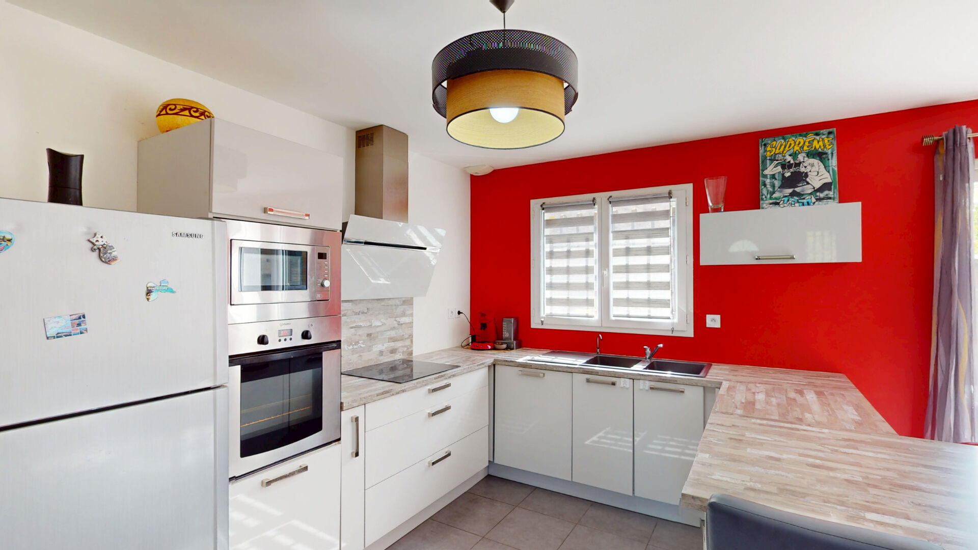 Située dans un quartier résidentiel calme, cette villa offre environ 82 m² habitables. Elle comprend au rez-de-chaussée une lumineuse pièce de vie avec cuisine ouverte équipée, un WC indépendant et un accès direct au garage.