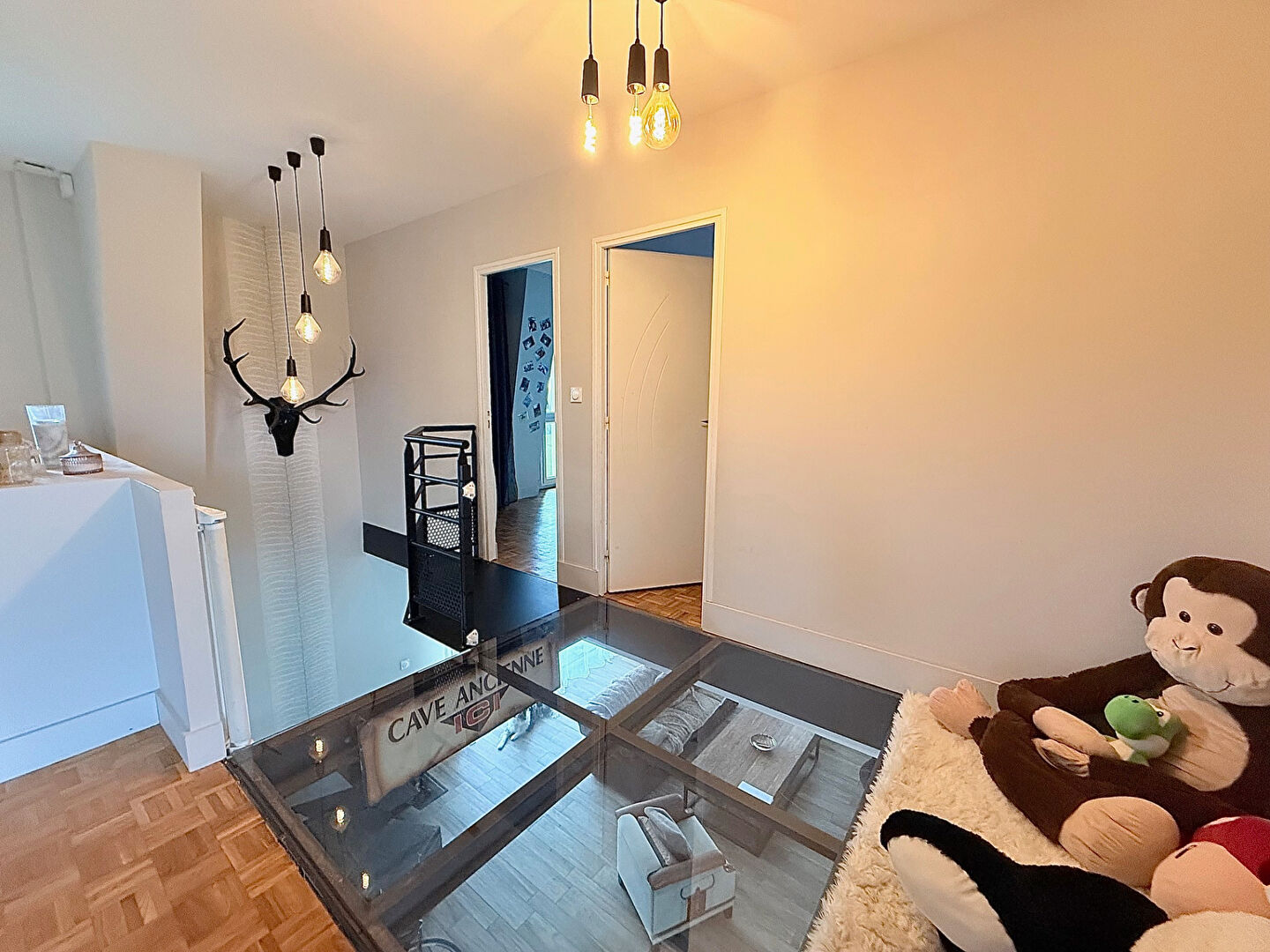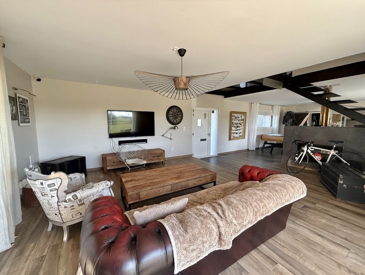 Au rez-de-chaussée, vous serez séduit par une superbe pièce de vie de 80 m², entièrement ouverte, comprenant une cuisine aménagée et équipée, un espace salle à manger et un séjour agrémenté d'un poêle à bois central et d'une cave à vin e Deux grandes baies vitrées offrent une luminosité exceptionnelle et un accès direct à une grande terrasse. Une arrière-cuisine ainsi qu'un WC avec point d'eau complètent ce niveau.