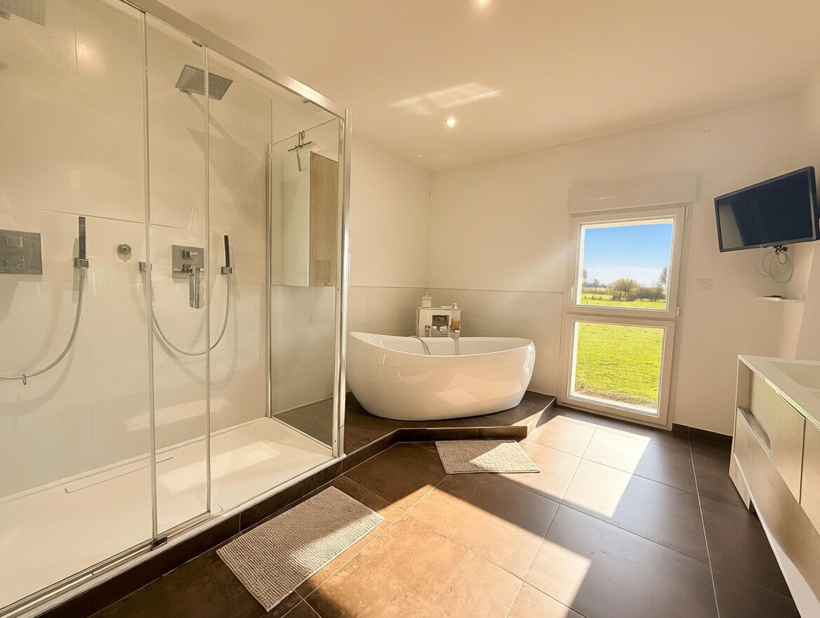 À l'étage, l'espace nuit se compose de trois chambres dont une de 25m², d'un bureau, wc indépendant, ainsi que d'une salle de bains spacieuse équipée d'une baignoire et d'une double douche.