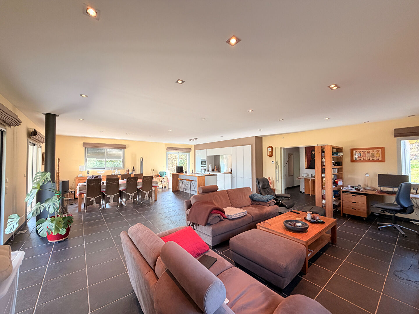 Chauffage au sol par pompe à chaleur , menuiseries double vitrage dans toute les pièces ainsi que des moustiquaires installé , panneaux photovoltaïque.
