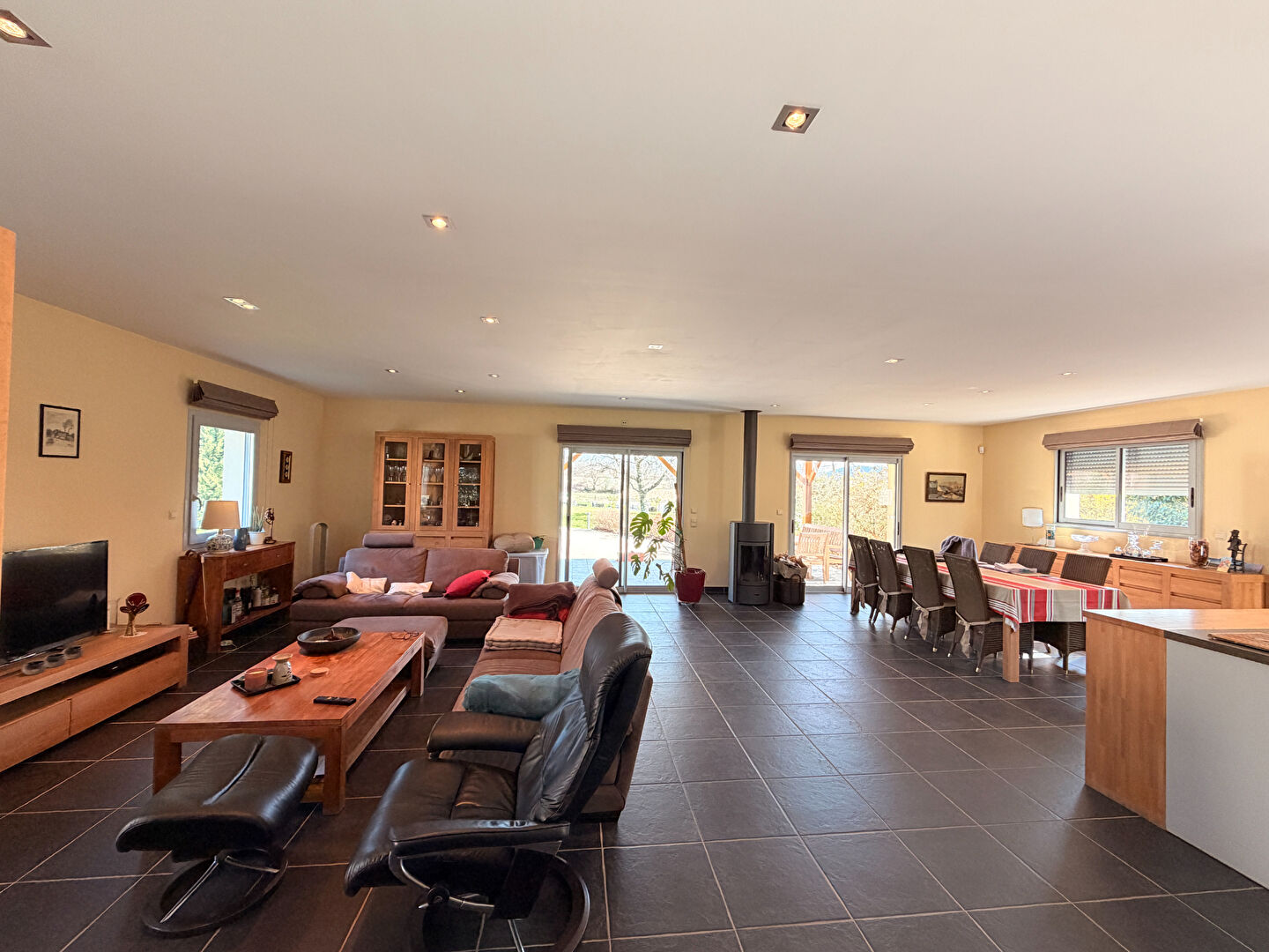 Entrée, cuisine équipée aménagé ouverte sur séjour (77m2) avec poêle à bois et accès terrasses, 3 chambres dont une suite parentale (avec son dressing et sa salle de bain et wc) une salle d'eau et un wc indépendant.