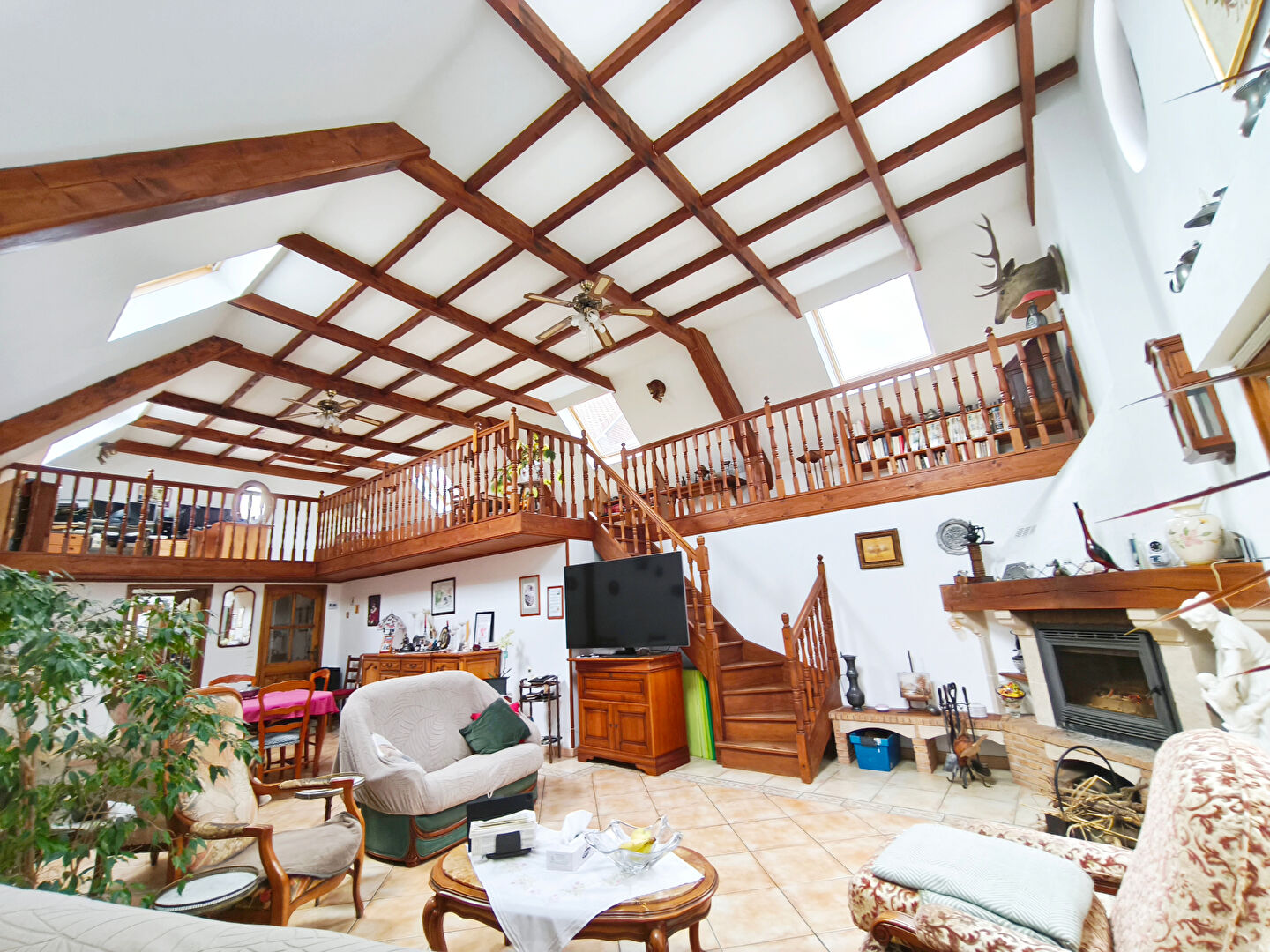 - Salon séjour lumineux avec cheminée, grande mezzanine et véranda